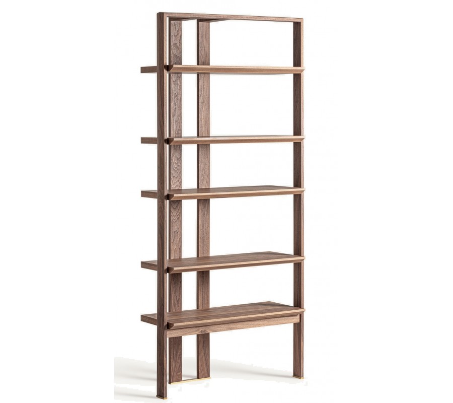 Regál má päť priestranných políc so skosenými rohmi, ktoré sú nielen funkčné, ale zároveň esteticky vyvážené. Unikátne riešené nožičky dodávajú konštrukcii stabilitu a vizuálnu dynamiku. Bočné nožičky sú uložené vertikálne a plynulo prechádzajú do horného rámu, zatiaľ čo zadné dve sú umiestnené v strede a horizontálne plochou stranou, čím vytvárajú zaujímavý architektonický prvok. Spojovacie dosky medzi zadnými nohami navyše posilňujú konštrukciu a zabezpečujú maximálnu pevnosť.
