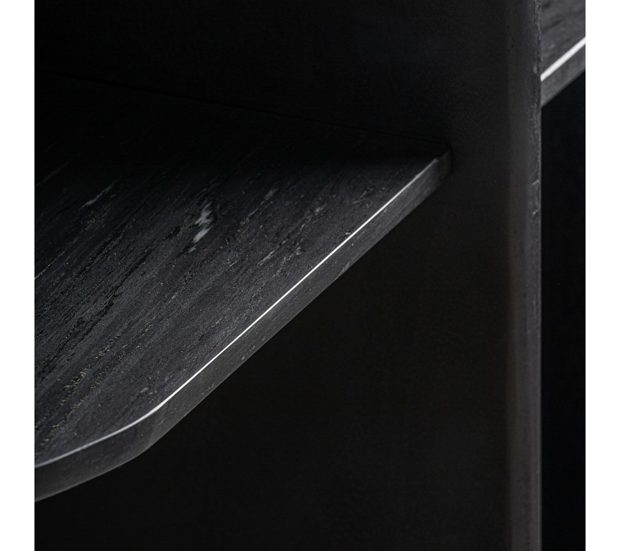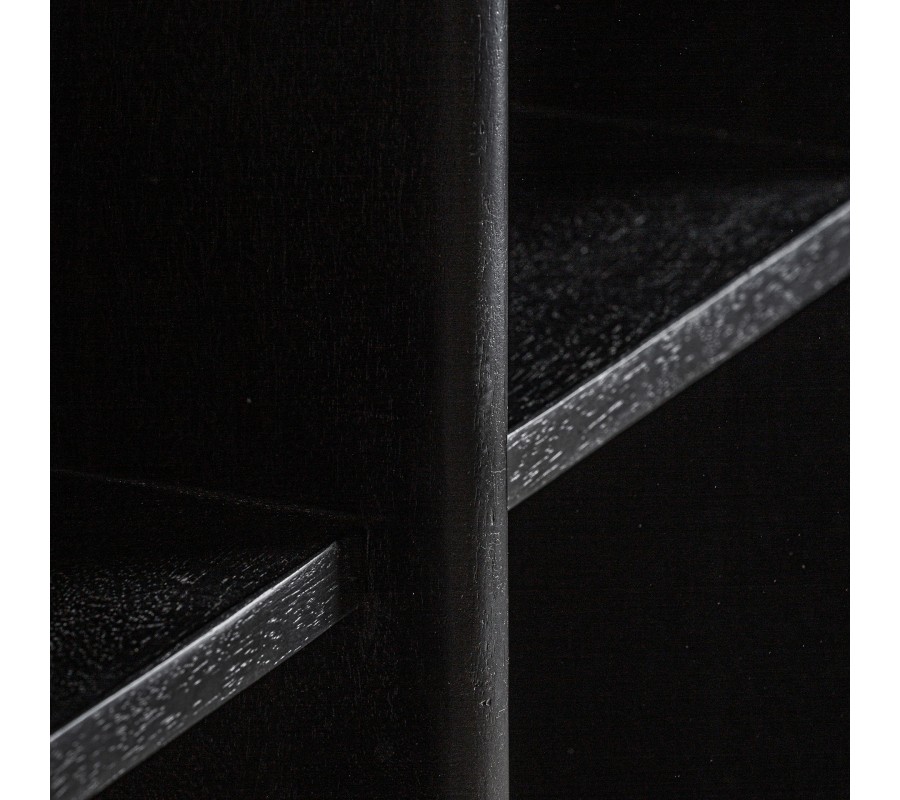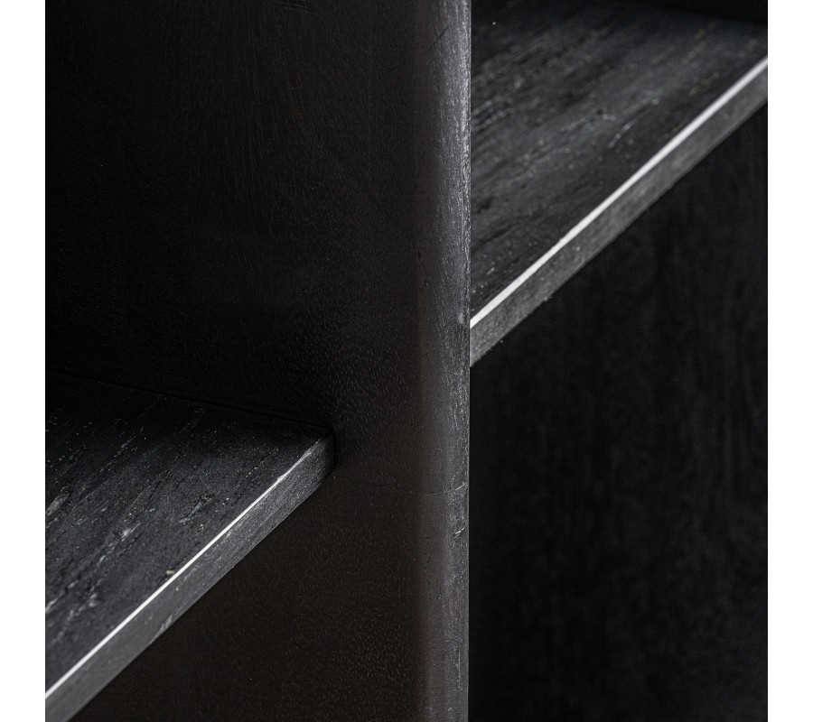 Knižnica Naria v modernom štýle spája minimalistickú estetiku s precíznym remeselným spracovaním. Jej obdĺžniková konštrukcia je vyrobená z masívneho mangového dreva s čiernou povrchovou úpravou, ktorá zachováva prirodzenú štruktúru materiálu a zvýrazňuje jeho autentický charakter. Čierny odtieň dodáva knižnici sofistikovaný vzhľad a robí z nej nápaditý a elegantný prvok.