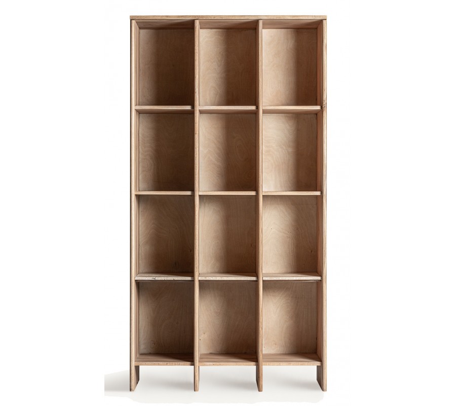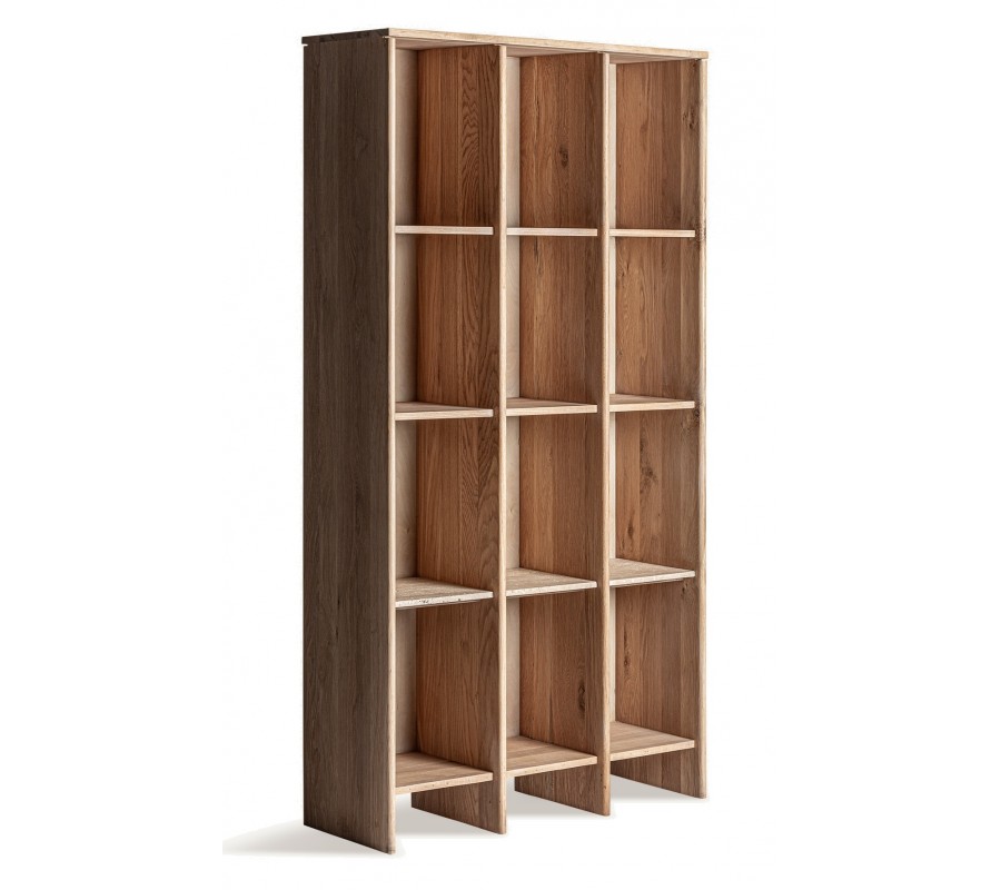 Vnútorné usporiadanie disponuje sériou dvanástich obdĺžnikových segmentov, ktoré poskytujú dostatok priestoru na uloženie kníh, dekorácií či osobných predmetov. Štyri pevne osadené police zabezpečujú stabilitu a dlhú životnosť, pričom otvorený dizajn umožňuje jednoduchý prístup. Jemne zaoblené hrany dodávajú knižnici vizuálnu ľahkosť a harmonicky ladia s celkovým dizajnom.