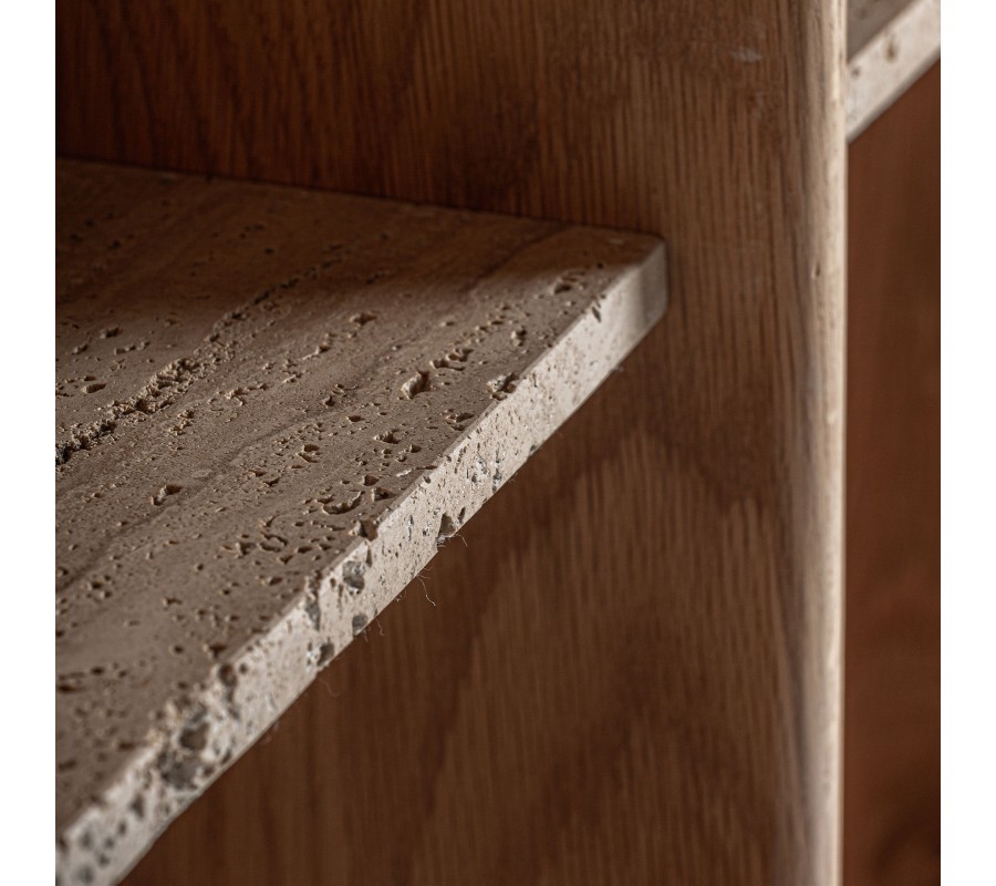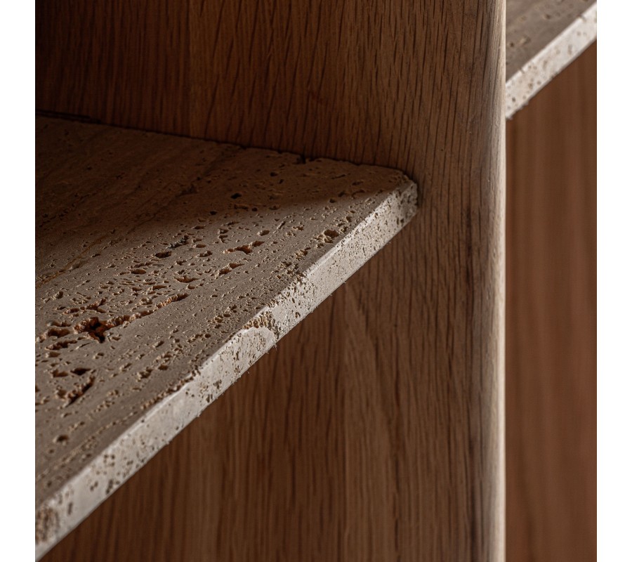 Knižnica Naria v škandinávskom štýle spája funkčnosť s prírodnou estetikou hnedého dubového dreva. Jej obdĺžniková konštrukcia je starostlivo spracovaná tak, aby zachovala prirodzenú štruktúru dreva, čím zvýrazňuje jej autentický charakter. Povrchová úprava s priznanou textúrou dreva dodáva knižnici charakteristický vzhľad a podčiarkuje jej remeselné spracovanie.