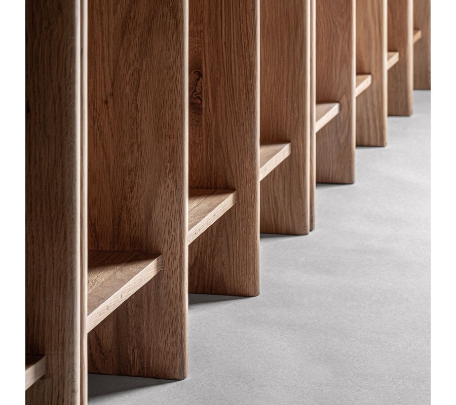 Konštrukcia regálu je premyslene riešená, štyri nožičky sú integrované do vnútorných priečok, ktoré plynulo prechádzajú až na spodok, čím vytvárajú stabilnú základňu. Povrch je lakovaný, čo zvyšuje odolnosť dreva a zároveň zvýrazňuje jeho prirodzenú kresbu.