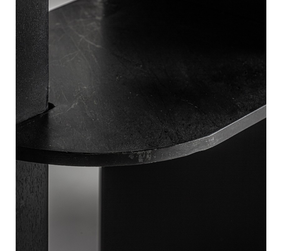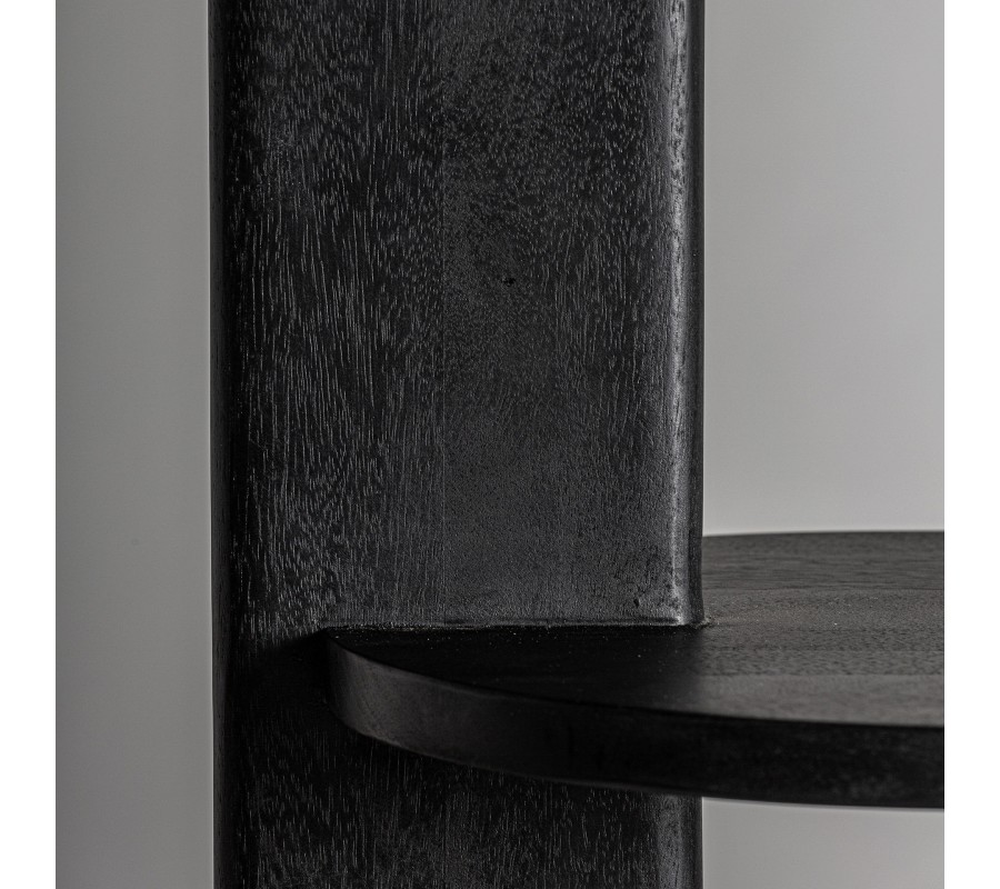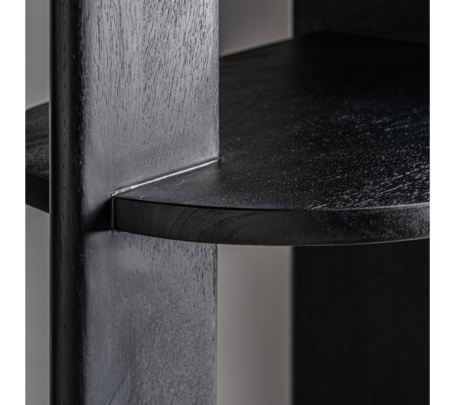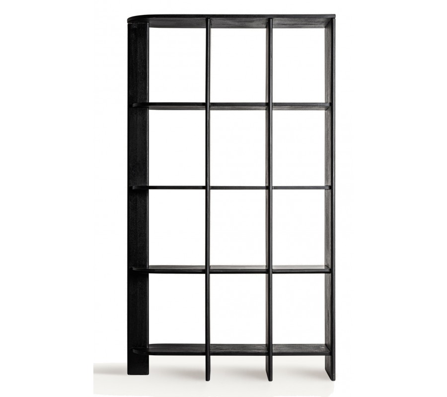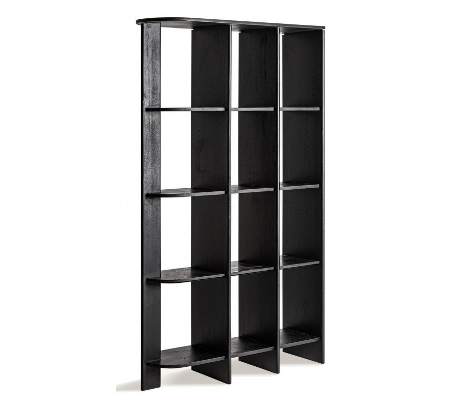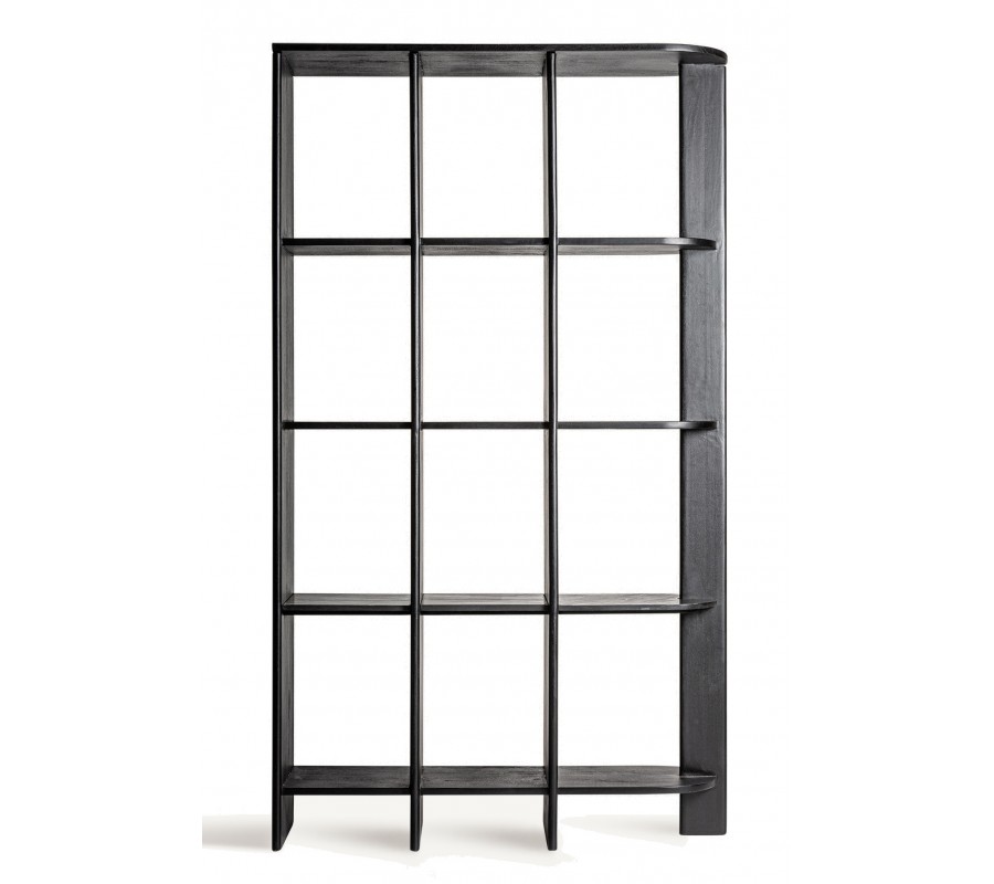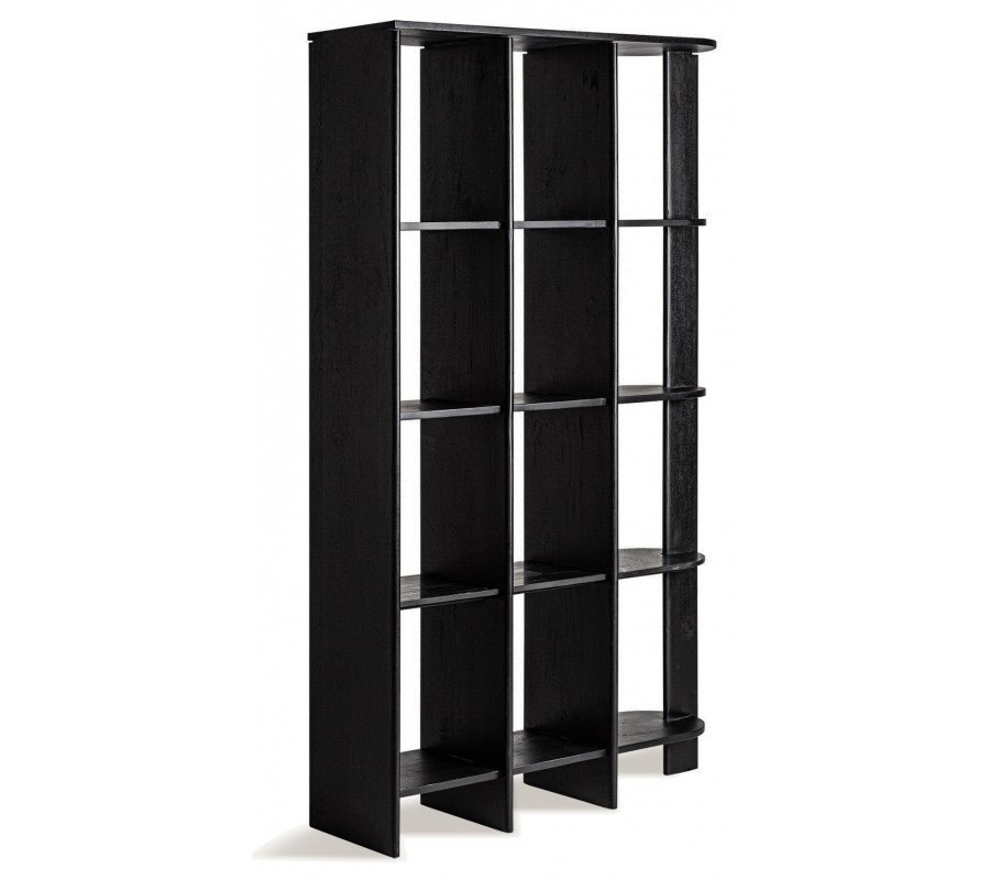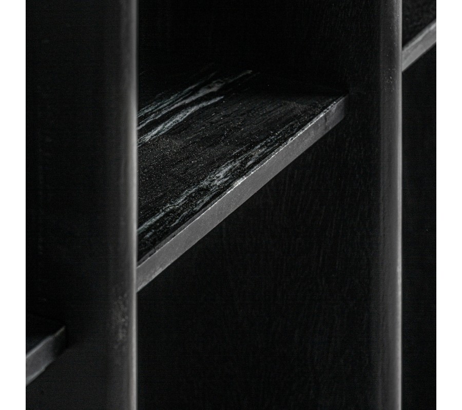 Luxusný moderný regál v obdĺžnikovom tvare je vyrobený z masívneho mangového dreva v čiernej farbe, pričom jeho výrazná štruktúra letokruhov dodáva povrchu autentický prírodný vzhľad. Regál obsahuje dvanásť poličiek, ktoré sú rovnomerne rozdelené a poskytujú dostatok úložného priestoru na knihy, dekorácie či iné predmety.