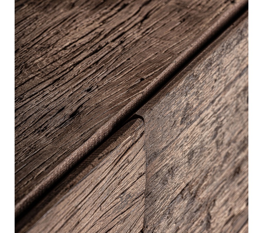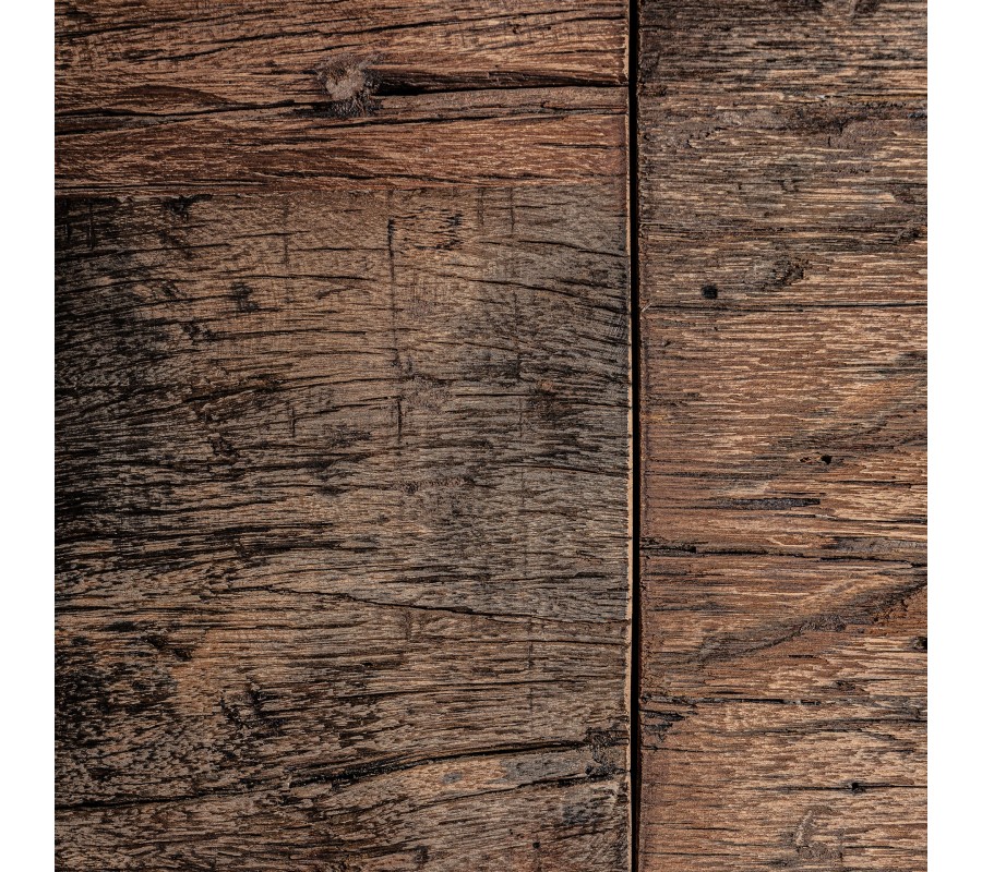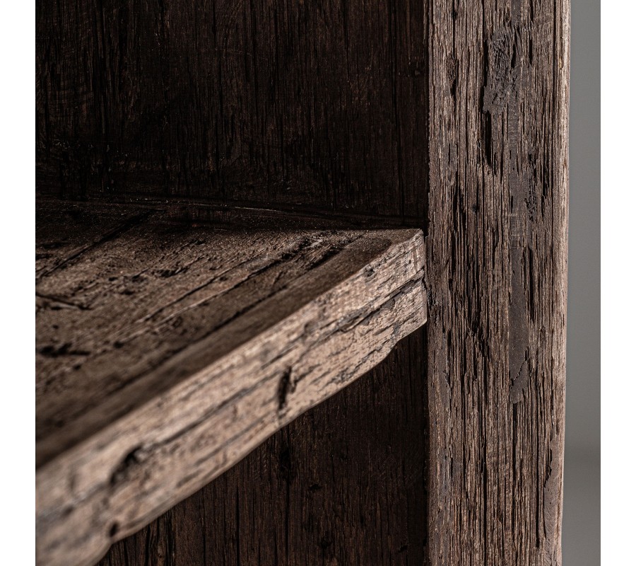 Luxusný rustikálny knižnicový regál Larena v sebe spája prírodnú surovosť a nadčasovú eleganciu. Vyrobený z masívneho recyklovaného dreva v hnedej farbe, jeho povrch nesie výraznú tmavú štruktúru letokruhov, ktorá mu dodáva autentický a prirodzený vzhľad. Obdĺžnikový tvar regálu pôsobí masívne a robustne, pričom jeho mohutný hrubý rám je súčasťou nožičiek, čo vytvára jednoliaty a stabilný dizajn.