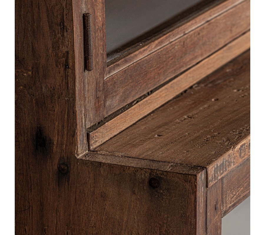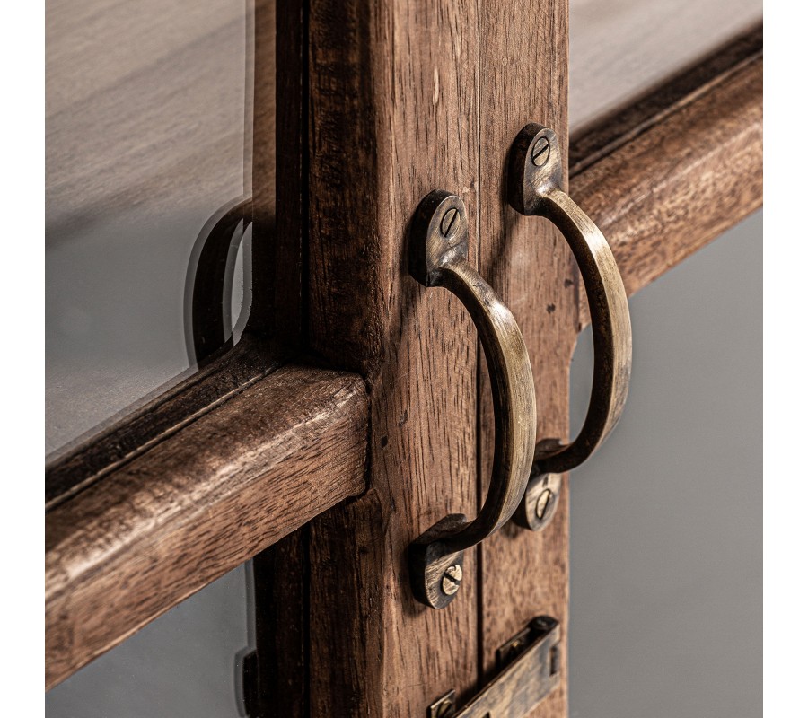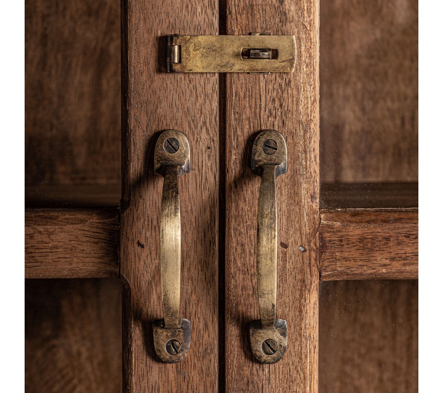 Každé dvierka sa dajú uzamknúť pomocou elegantného kovového zámku v zlatej farbe s mierne patinovaným povrchom. Ten istý materiál a povrchová úprava boli použité aj na kovové oblúkové úchytky, ktoré dotvárajú autentický vintage vzhľad. Spodná časť vitríny je mierne vysunutá, čím vytvára optickú aj funkčnú horizontálnu líniu a poskytuje priestor na odkladanie dekorácií alebo kníh. Sklenené výplne na dvierkach zabezpečujú prehľadnosť obsahu, pričom zachovávajú uzavretý úložný priestor.