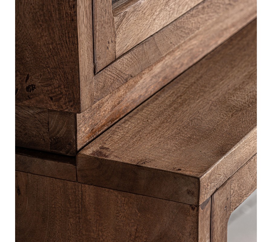 Povrchová úprava dreva zvýrazňuje prirodzenú kresbu a štruktúru mangového dreva, čím dodáva knižnici jedinečný charakter. Tento nábytok sa výborne hodí do rustikálnych, vintage, koloniálnych alebo vidieckych interiérov, kde vynikne v kombinácii s ďalším dreveným nábytkom, koženými doplnkami či textíliami v prírodných tónoch. Skvelo sa kombinuje so zemitými farbami, mosadznými prvkami alebo starými knihami a keramikou.
