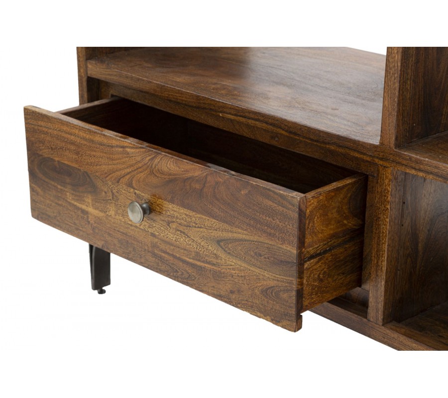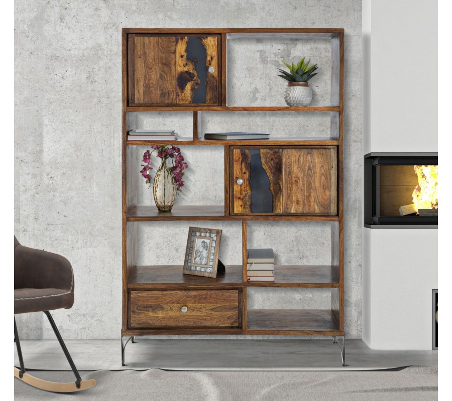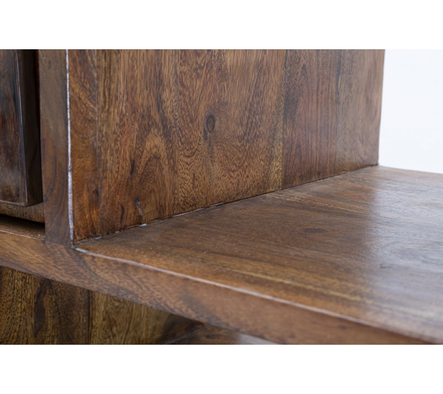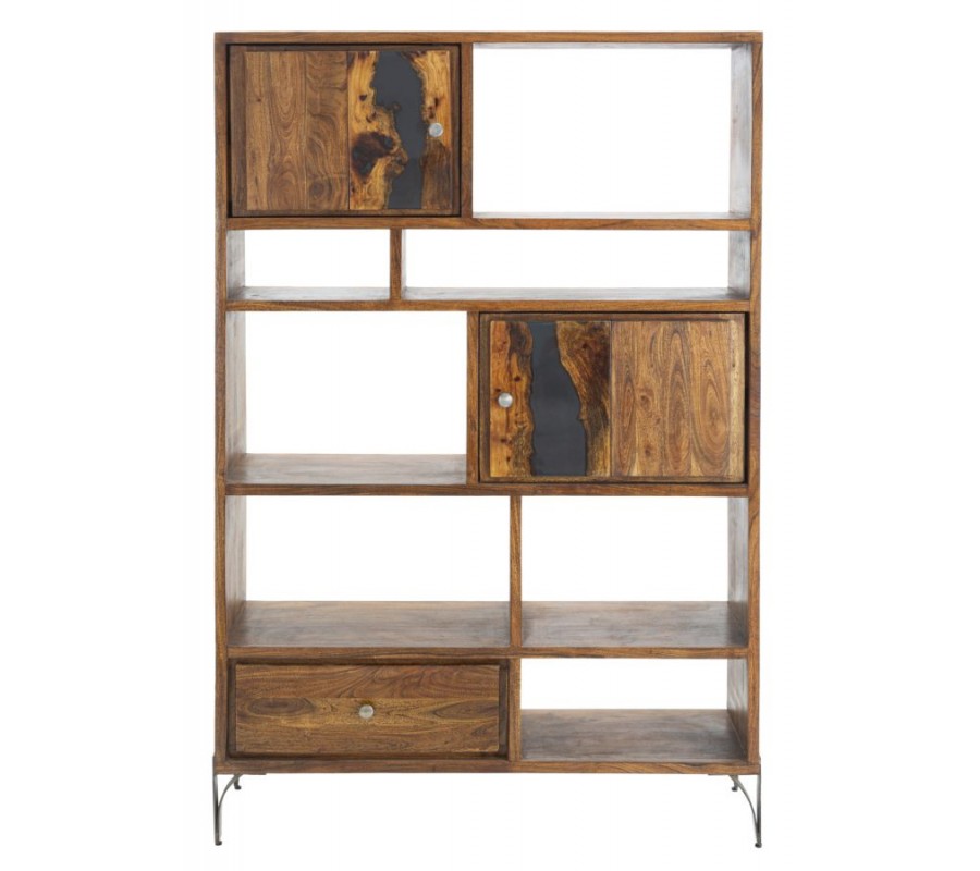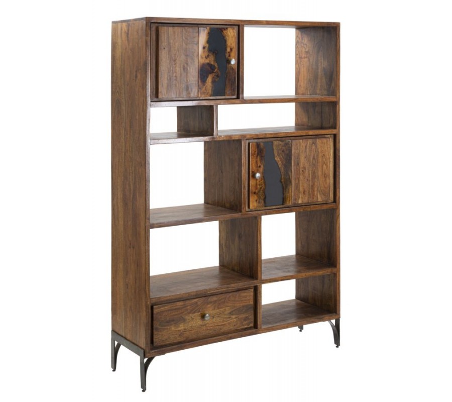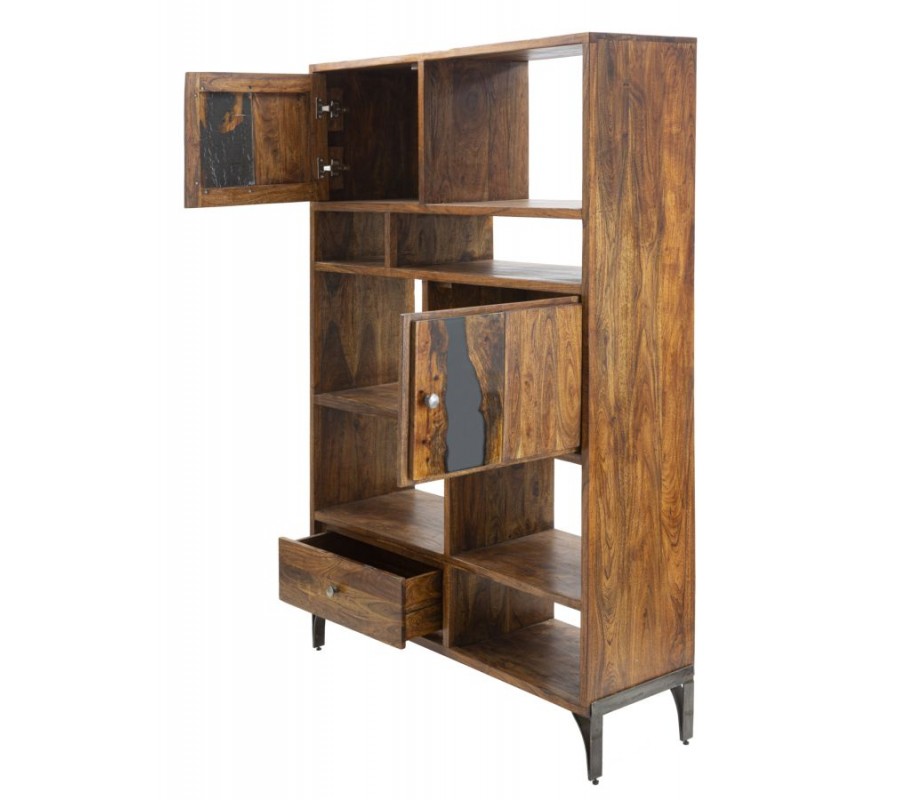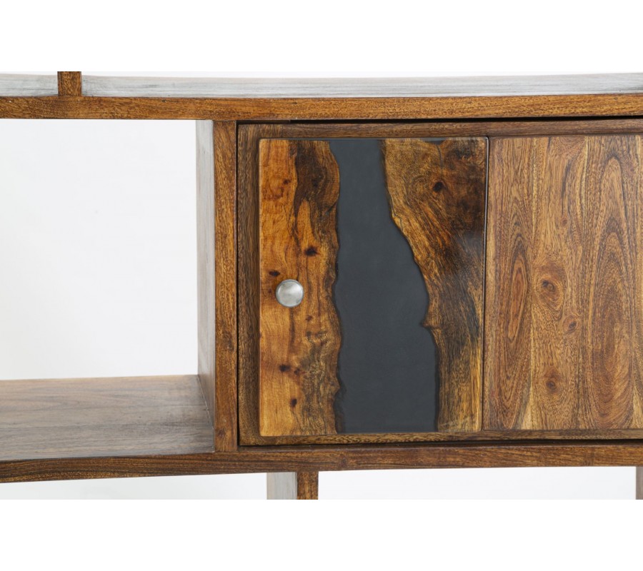 Luxusný koloniálny regál Selvaggio v asymetrickom dizajne kombinuje otvorené a uzavreté úložné priestory s originálnym výtvarným prevedením. Je vyrobený z masívneho dreva s dyhovaným povrchom v teplom tmavohnedom odtieni s viditeľnou kresbou a rustikálnou štruktúrou, ktoré vytvárajú prirodzený a elegantný vzhľad.