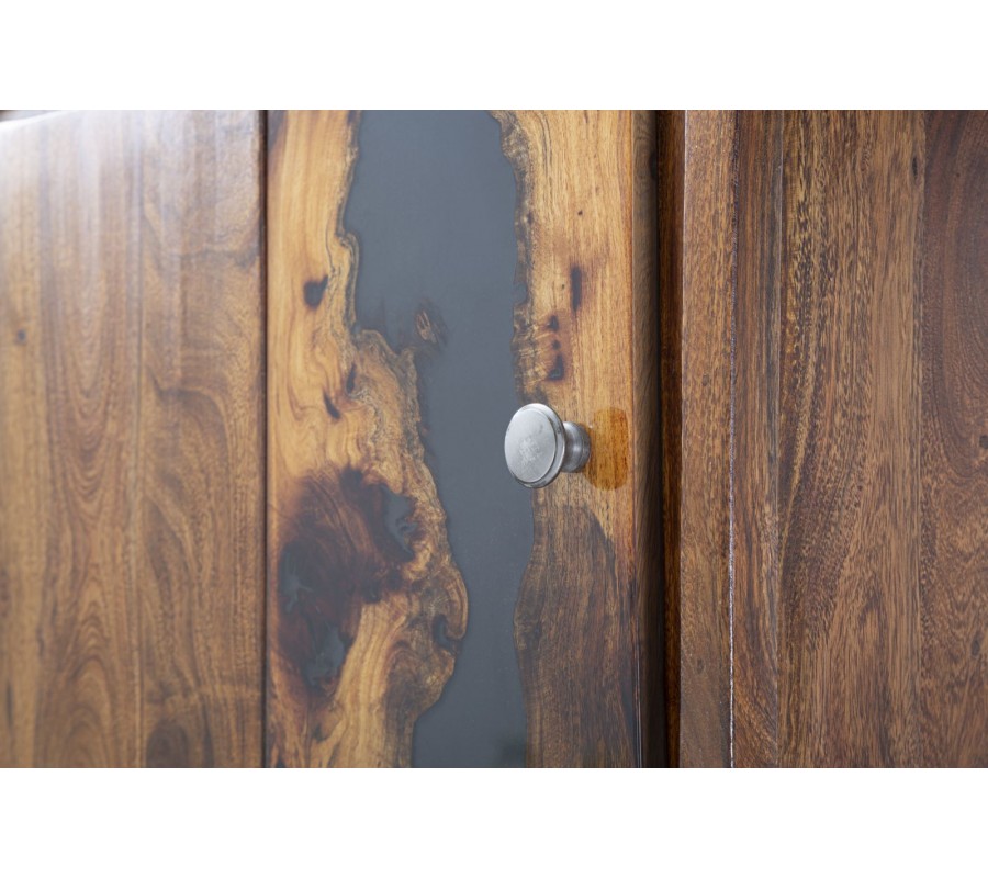 Dvierka dvoch horných skriniek sú ozdobené čiernymi živicovými výplňami s nepravidelným tvarom, ktoré pripomínajú prírodný rez drevom. Kontrast medzi organickým dekorom a hladkým povrchom vytvára výnimočný vizuálny efekt. Úchytky na zásuvkách aj skrinkách sú kovové s okrúhlym tvarom a decentným leskom, čo zaisťuje ich praktické a estetické využitie.