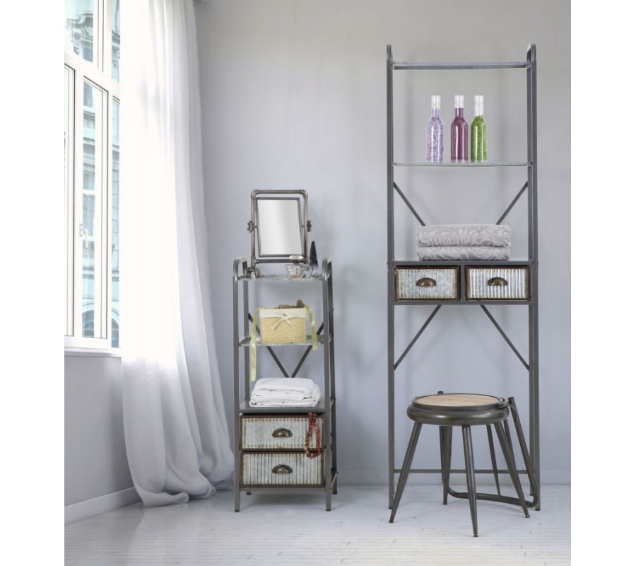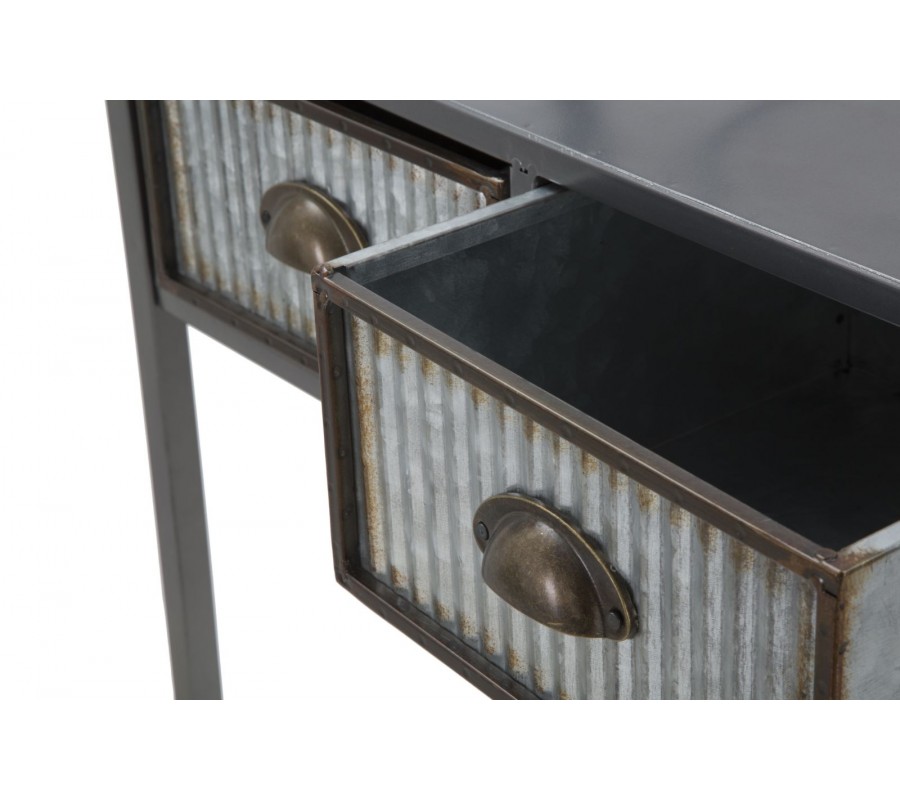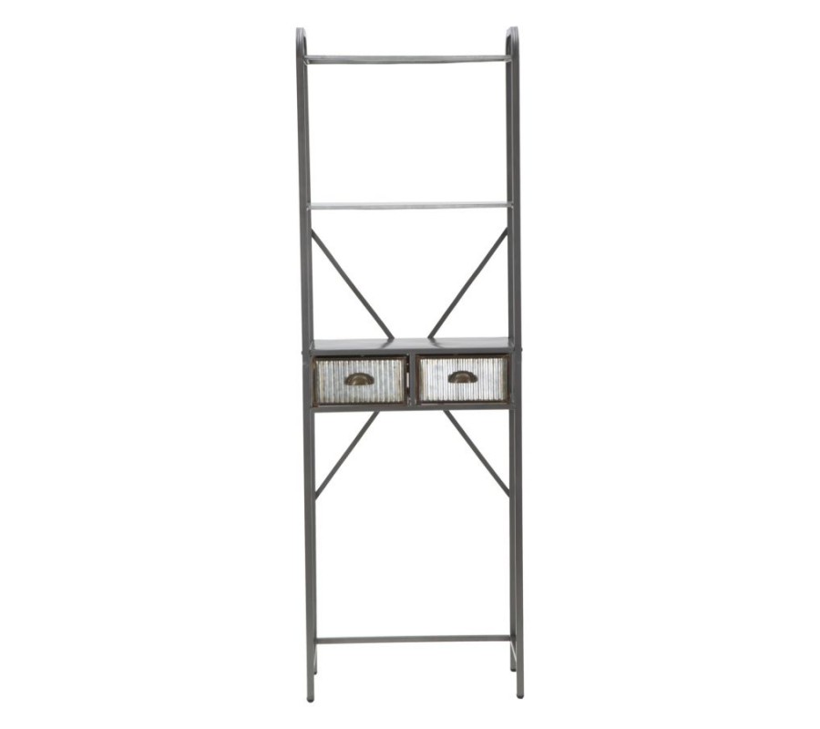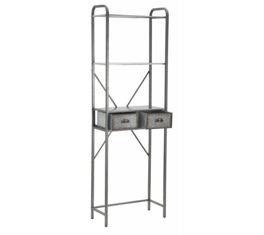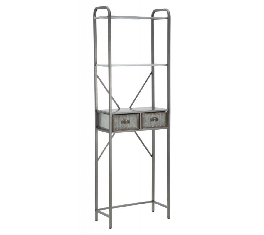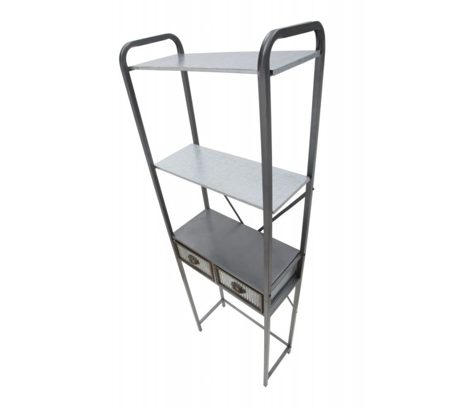 V hornej časti regálu sa nachádzajú tri otvorené police, ideálne na vystavenie kníh, rastlín, úložných boxov či dekorácií. Dolná časť ponúka dve zásuvky, ktorých predná strana je z vlnitého plechu, čím evokuje surový charakter priemyselných materiálov. Zásuvky majú kovové úchytky v tvare polmesiaca, ktoré dobre padnú do ruky a zároveň esteticky dotvárajú vzhľad. Povrch celého regálu je ladený do sivého kovového odtieňa s viditeľnou efektnou hrdzavou patinou, ktorá mu dodáva autentický opotrebovaný vzhľad.