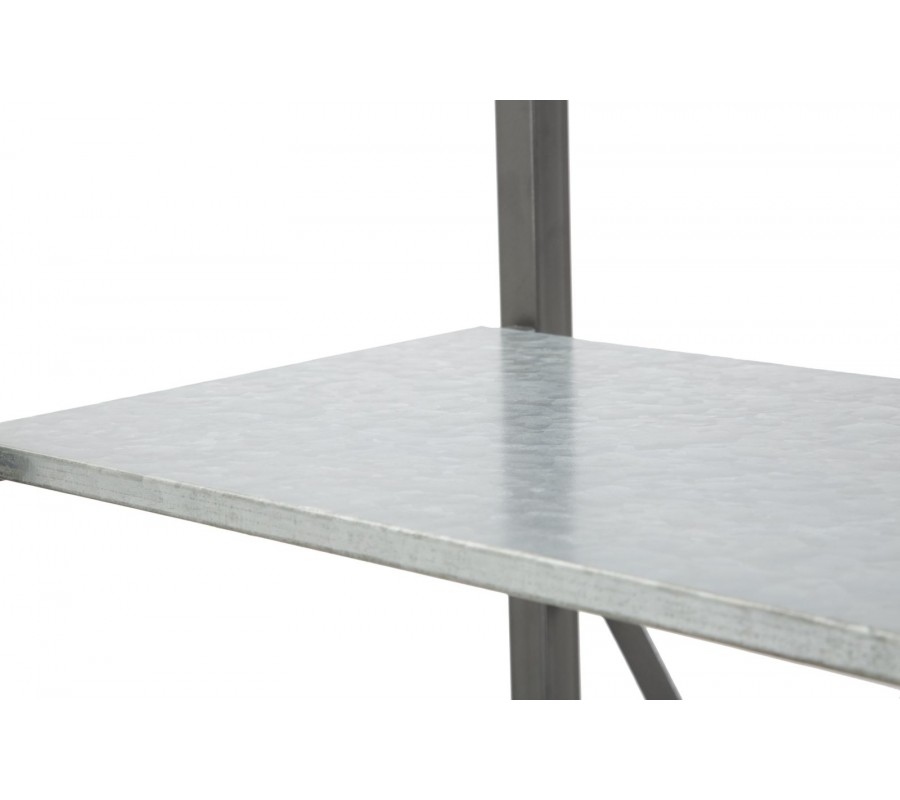 Charakteristickým detailom sú jemne zaoblené horné spojovacie tyče, ktoré sa oblúkom napájajú na zvislé prvky konštrukcie a pripomínajú rám regálov z tovární či starých dielní. Regál je vyrobený z pevného kovu, vďaka čomu pôsobí odolne a stabilne aj pri vyššej záťaži. Vzhľadom na rozmiestnenie políc vo vrchnej časti možno spodnú časť regálu využiť aj ako písací alebo konzolový stôl, čím sa zvyšuje jeho funkčnosť.