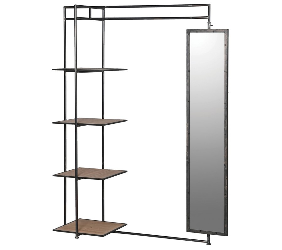 Industriálny vešiakový regál Raxon z kovu s policami z hnedého dreva a zrkadlom v čiernom ráme 194 cm