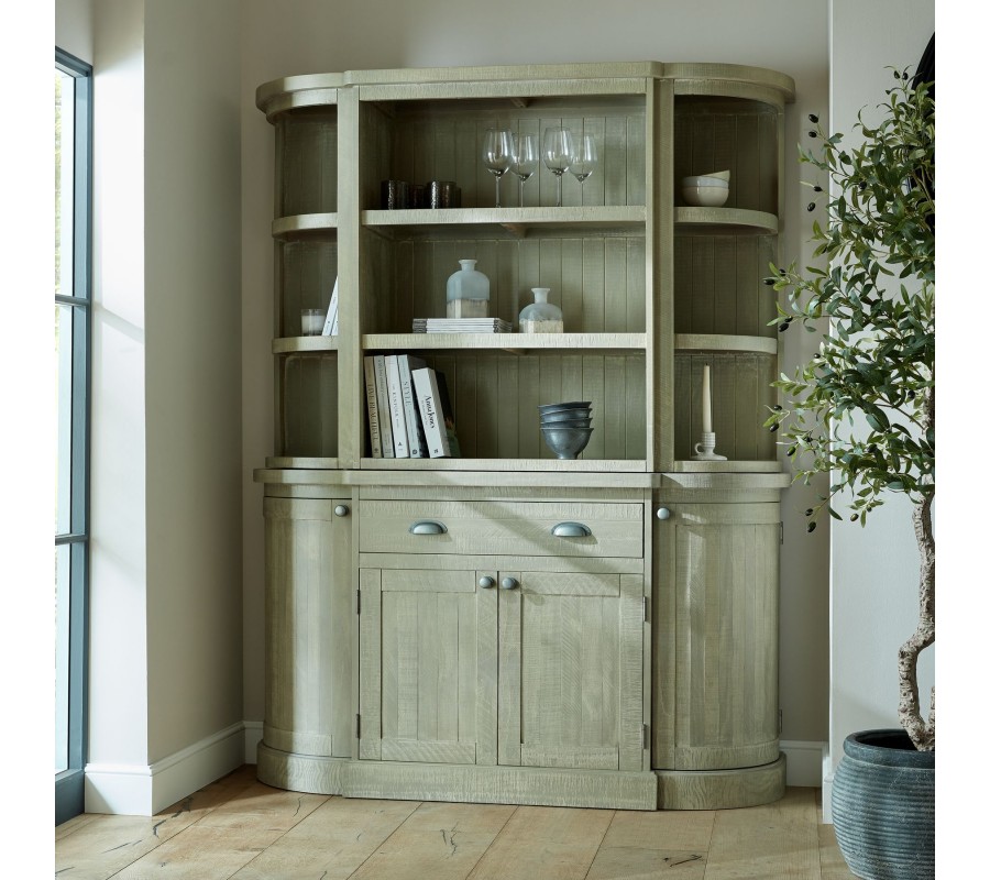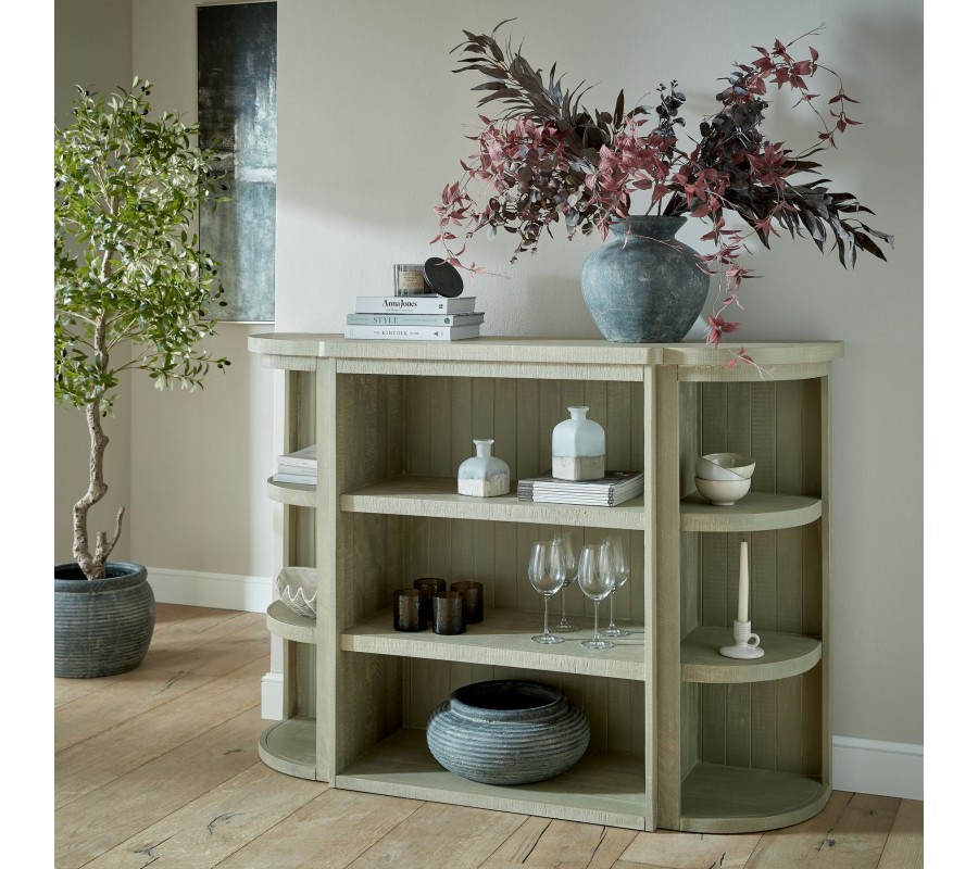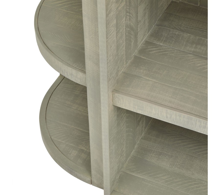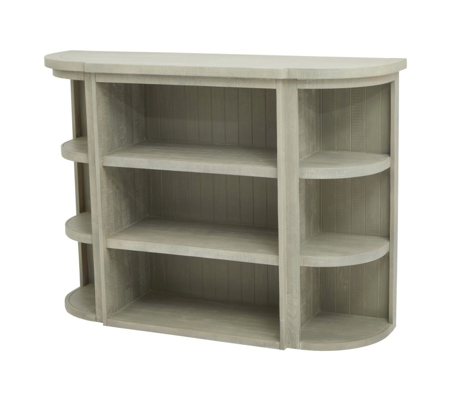 Luxusná vidiecka sivá zaoblená knižnica Alder z masívneho dreva s tromi policami a dekoračnou vrchnou doskou 153 cm