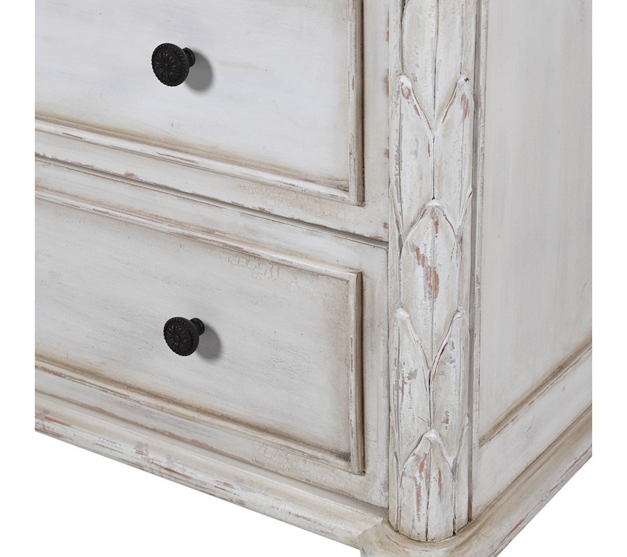Vrchná zásuvka je nižšia a v spodnej časti ju vymedzuje ďalšia ozdobná lišta. Dve zásuvky pod ňou sú vyššie a na bočnej zaoblenej hrane ich zdobí vyrezávaný florálny motív prekrývajúcich sa listov. Tento dekor presahuje až do vrchnej časti profilovaných nožičiek s dizajnom sústruženého dreva.