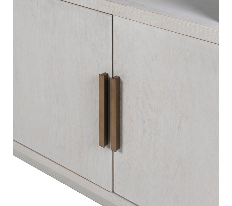 Spodná časť knižnice je riešená ako štvordverová skrinka, ktorá poskytuje bohatý úložný priestor. Je rozdelená policou, čím vzniká praktické miesto na uskladnenie dokumentov, porcelánu alebo domácich doplnkov. Otváranie je riešené pomocou štíhlych vertikálnych kovových úchytiek v patinovanom mosadznom prevedení, ktoré dodávajú nábytku elegantný kontrast.