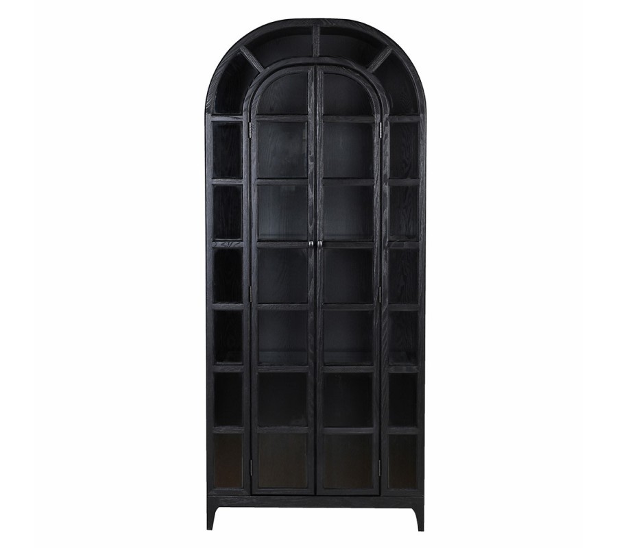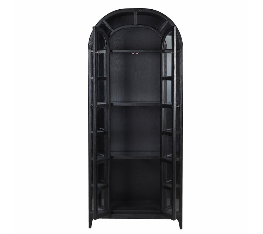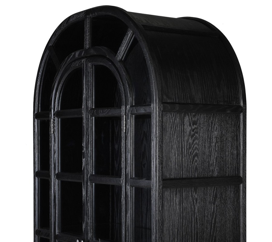 Luxusná art deco čierna knižnica Arc Noir z masívneho dubového dreva s poloblúkovým vrchom a presklenými dvierkami 219 cm