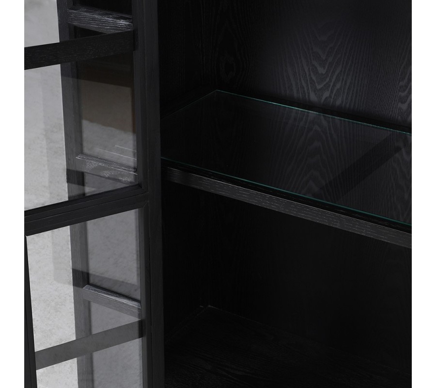 Vo vnútri sa nachádza šesť políc z tvrdeného bezpečnostného skla, ktoré poskytujú dostatok miesta na knihy, dekorácie či umelecké predmety. Sklo je priehľadné, vďaka čomu vynikne usporiadaný obsah a zároveň pôsobí vzdušne v kontraste s tmavým drevom. Celok podopierajú nízke, diskrétne nožičky, ktoré nenápadne odľahčujú masívnu konštrukciu.