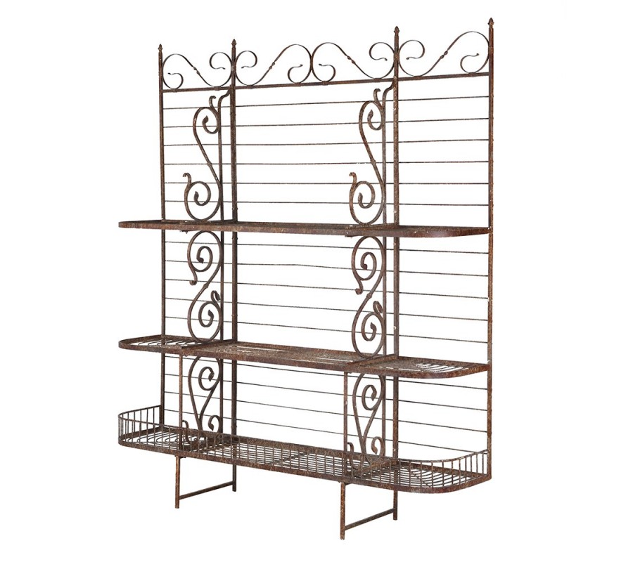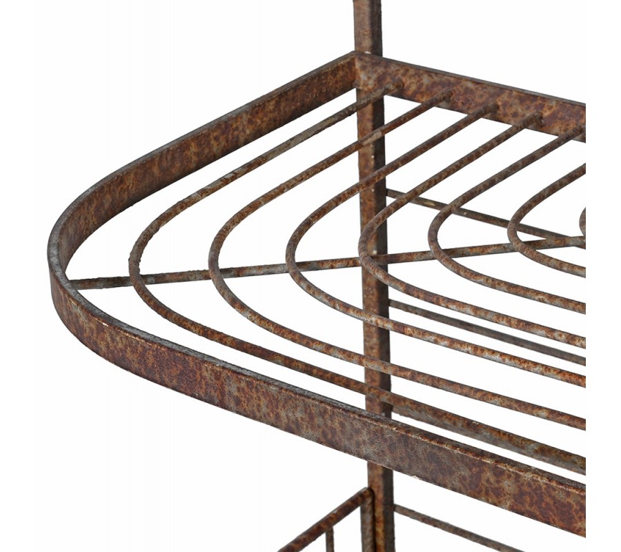 Luxusný vintage záhradný kovový regál Rustique s tromi poličkami a dekoratívnymi špirálami s dizajnom hrdze 235 cm