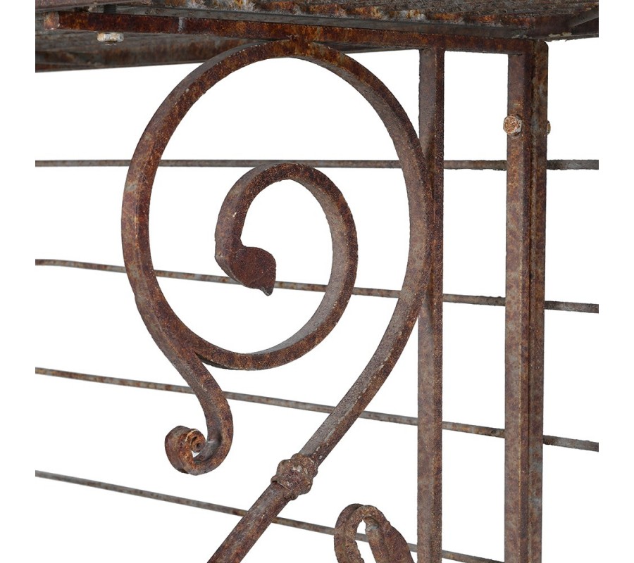 Luxusný vintage záhradný kovový regál Rustique predstavuje majstrovský kus nábytku, ktorý spája umelecké spracovanie kovu s autentickou hrdzavou patinou. Každý detail bol navrhnutý tak, aby vyvolal pocit historickej jedinečnosti a nadčasovej elegancie.