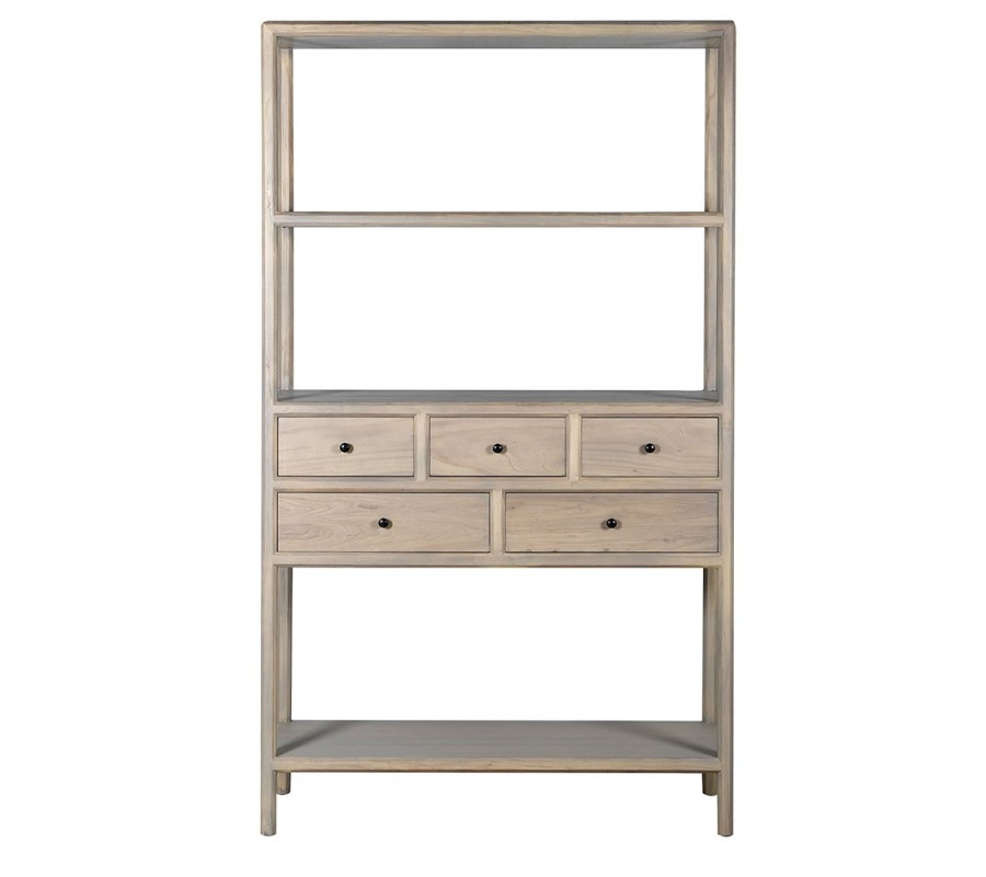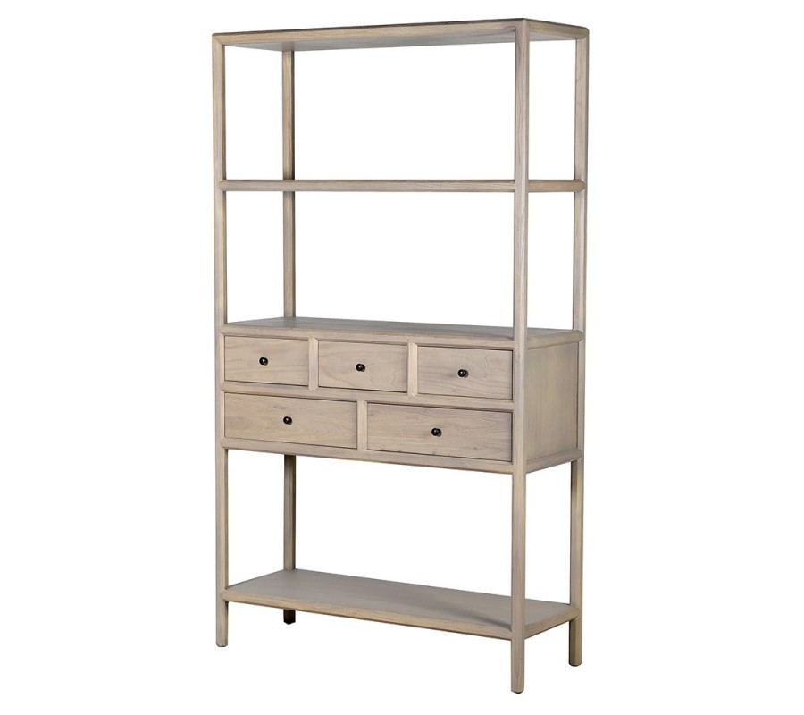 Regál má modernú lineárnu siluetu s obdĺžnikovým pôdorysom. Valcovité nožičky plynule prechádzajú do štíhleho rámu, lemujúceho nábytok po celej výške. V spodnej časti je do neho zasadená otvorená polica a nad ňou sa v strednej časti nachádza uzavretý úložný segment, obsahujúci päť zásuviek, organizovaných v dvoch radoch. Jeho vrchná časť slúži ako ďalšie policové miesto a nad ňou je umiestnená posledná tretia polica.