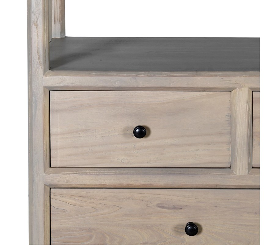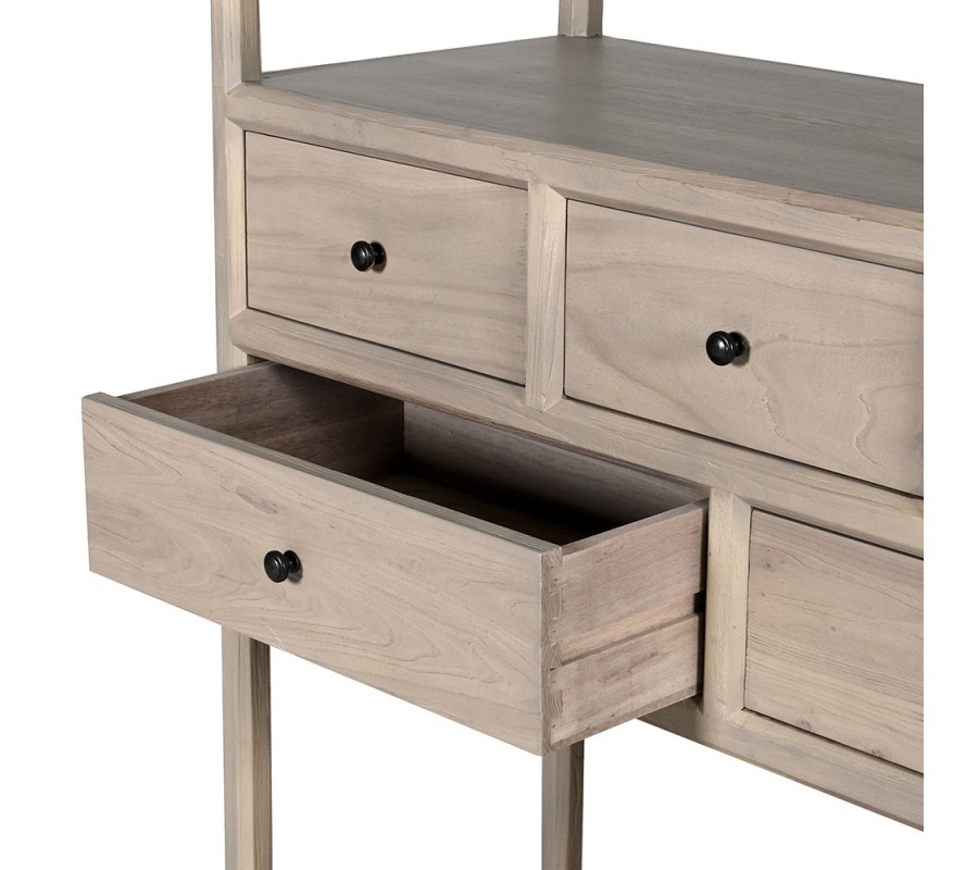 Strany regálu sú otvorené a nábytok tak pôsobí odľahčeným vzdušným dojmom. Vrch je prekrytý doskou, čo chráni uložené predmety pred prachom. Štedrá výška políc umožňuje aj uskladnenie väčších predmetov, či úložných boxov a košov. Malé kovové úchytky zásuviek majú minimalistický okrúhly tvar a kontrastnú čiernu farbu.