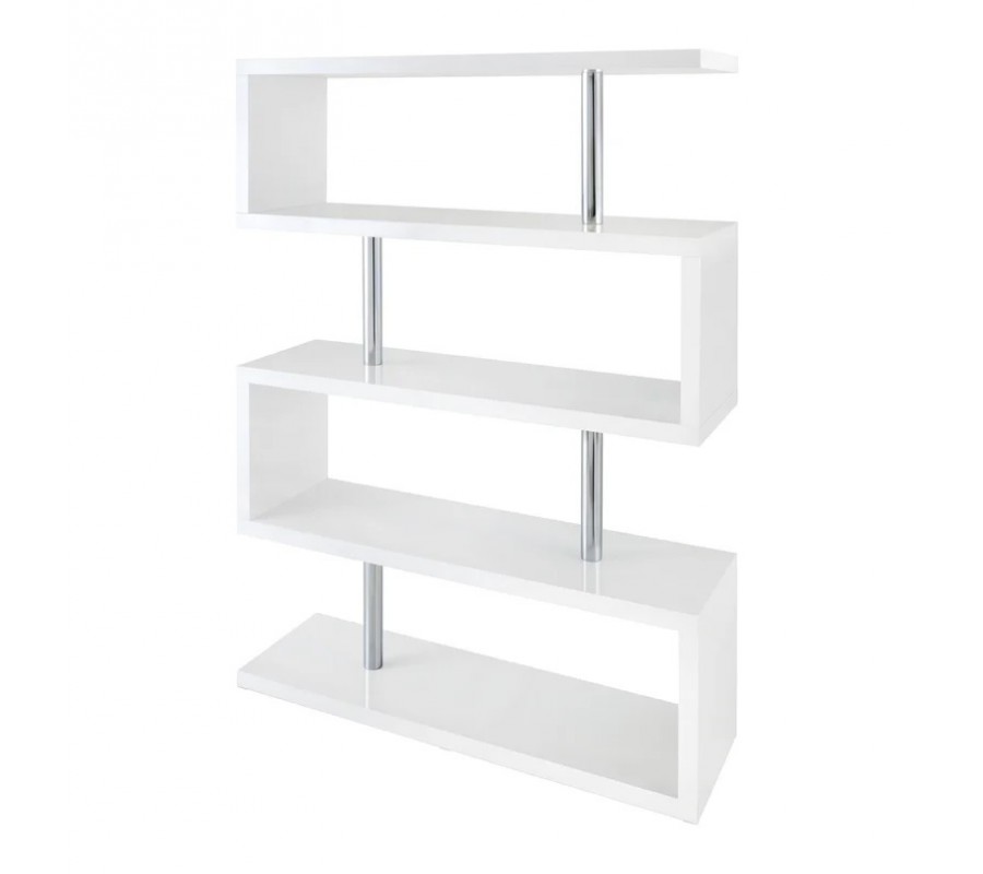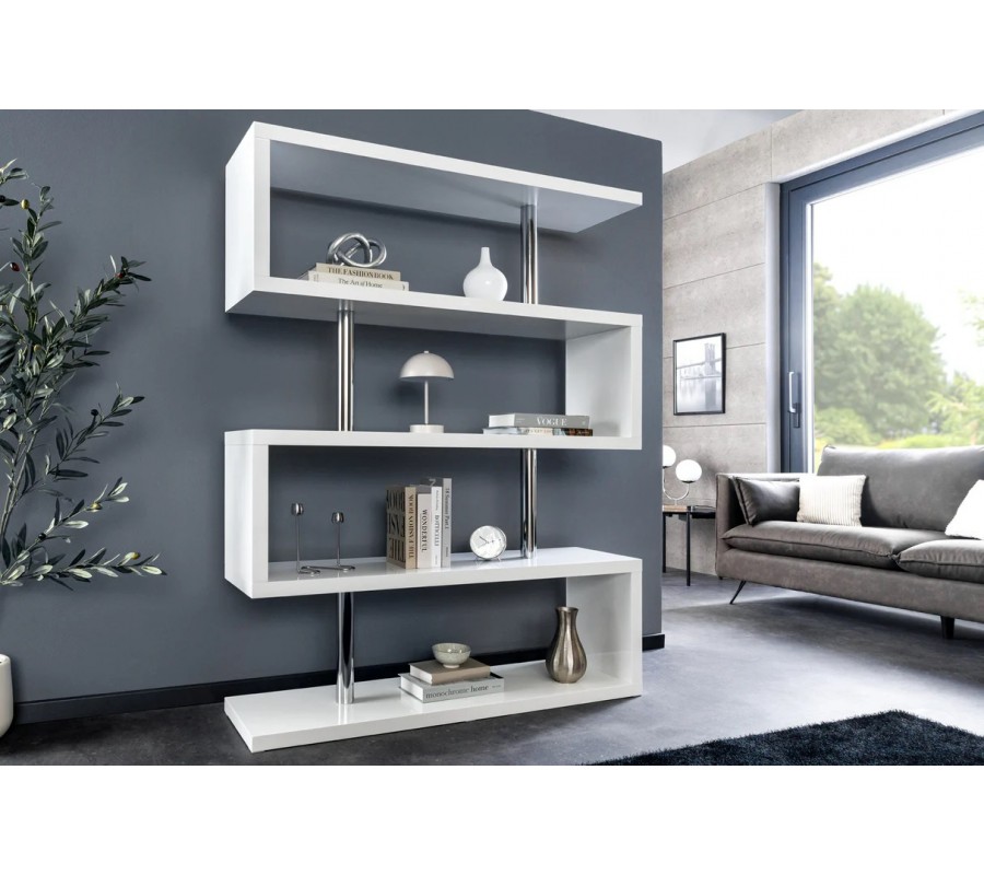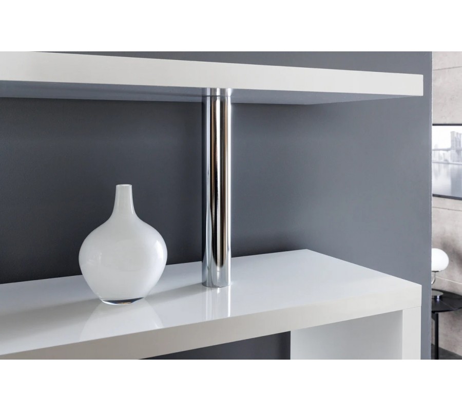 Moderný biely lesklý regál Culebra so štyrmi policami s asymetrickým prepojením a lesklými chrómovými detailmi 165 cm