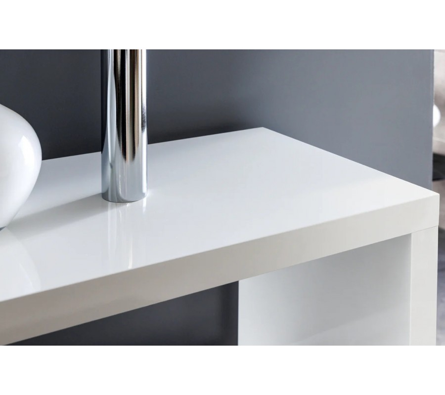 Regál je vyrobený z kvalitnej dyhy s lesklou bielou povrchovou úpravou. Moderný vizuál dotvára chrómové prevedenie kovových častí. Reflexné povrchy a svetlá farba pôsobia odľahčeným a vzdušným dojmom, ktorý podčiarkuje aj otvorená predná a zadná strana. Regál tak môžete postaviť k stene, či umiestniť voľne do priestoru v úlohe predeľovača.