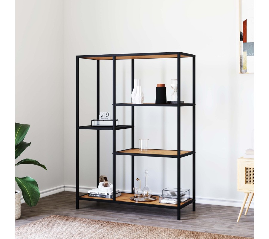 Knižnica má štyri police, ktoré sú usporiadané v otvorenej konštrukcii s asymetrickým rozdelením. Police sa striedajú v rôznych výškach a šírkach, čím vzniká dynamická kompozícia vhodná na uloženie kníh, dekorácií, rastlín či úložných boxov. Toto riešenie zároveň rozbíja pravidelnosť klasickej knižnice a dodáva nábytku moderný vizuálny charakter.