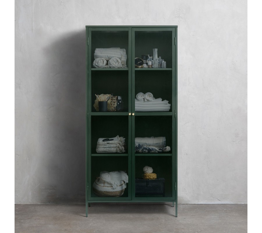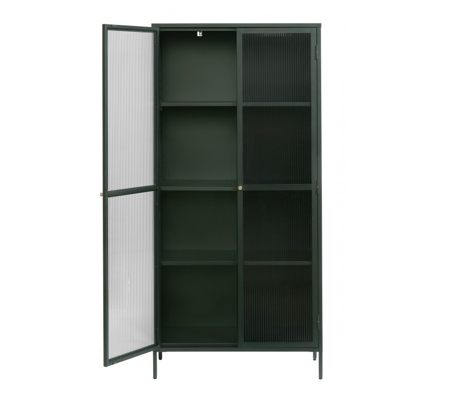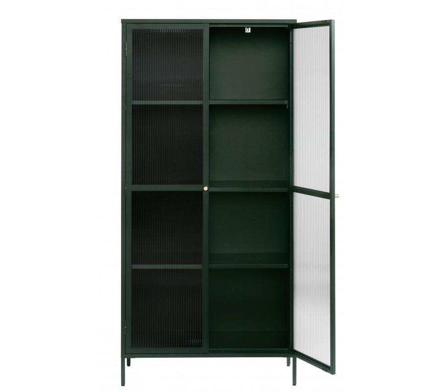 Moderná industriálna zelená knižnica Farver z kovu so sklenenou rebrovanou výplňou s tromi policami 190 cm