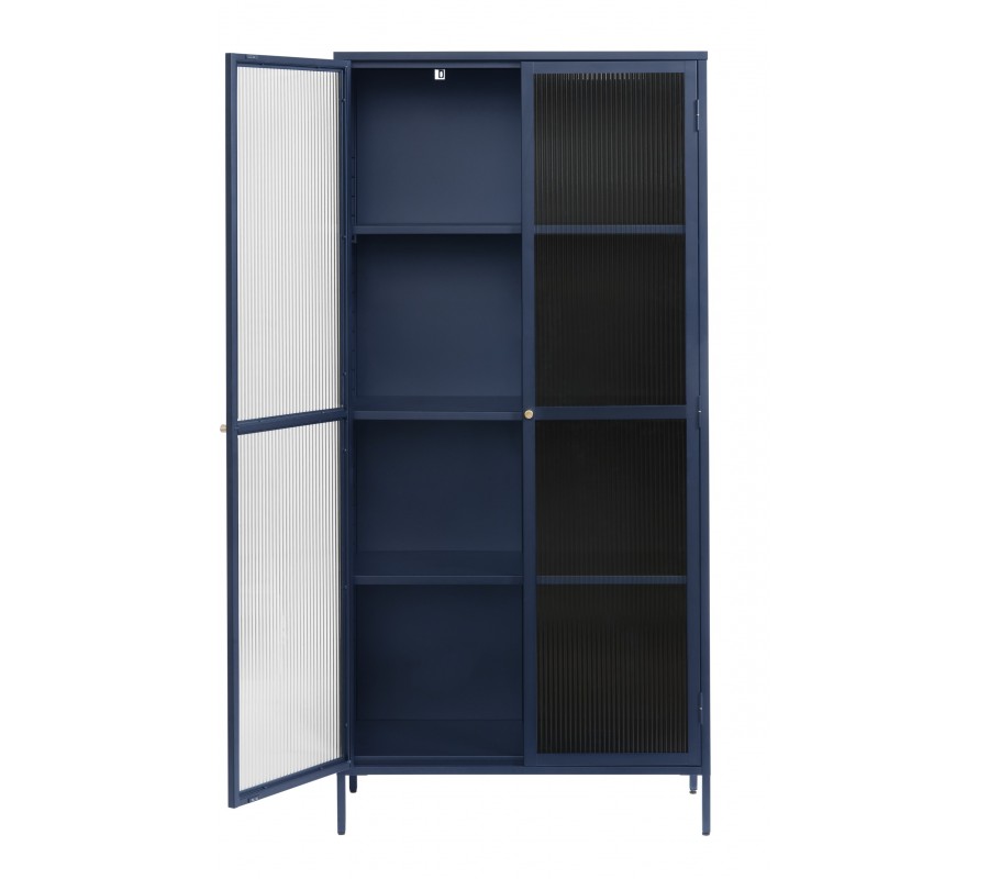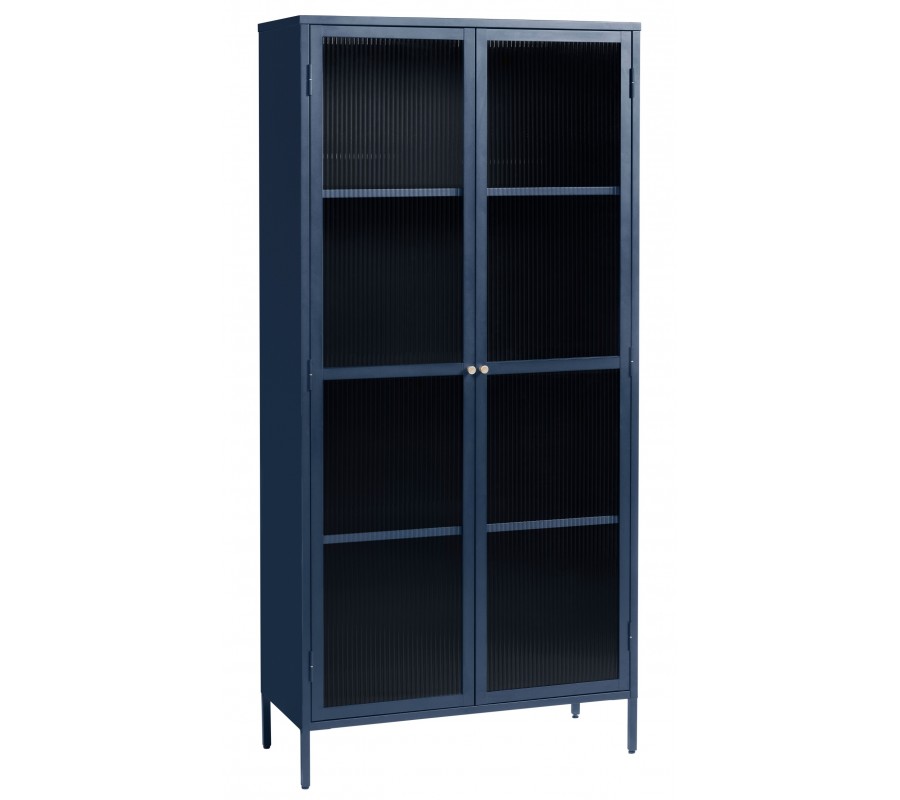 Moderná industriálna dvojdverová modrá knižnica Farver z kovu so sklenenými vrúbkovanými výplňami s tromi policami 190 cm