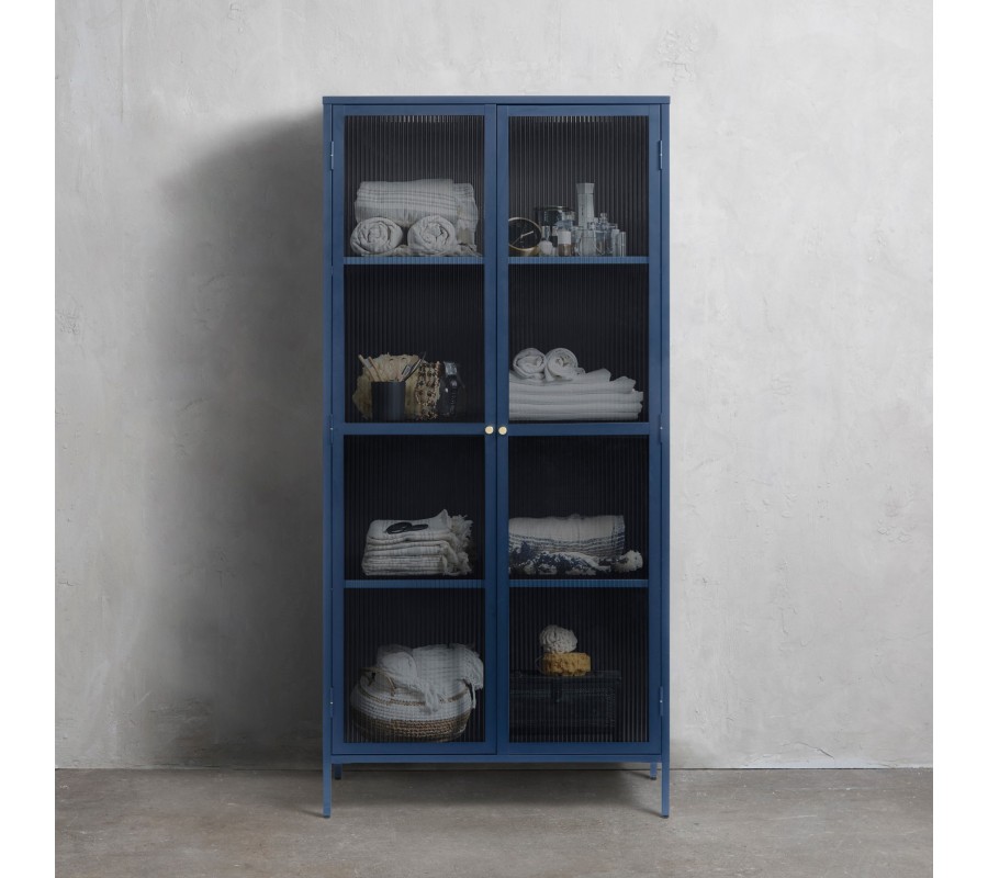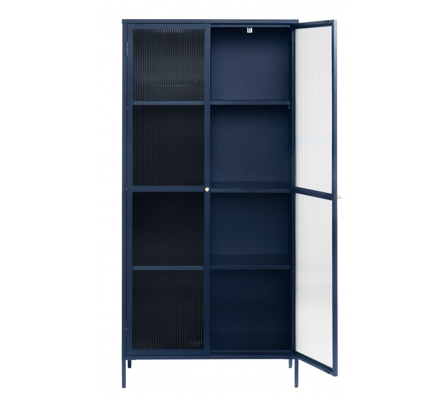 Moderná industriálna dvojdverová modrá knižnica Farver z kovu so sklenenými vrúbkovanými výplňami so štyrmi policami 190 cm