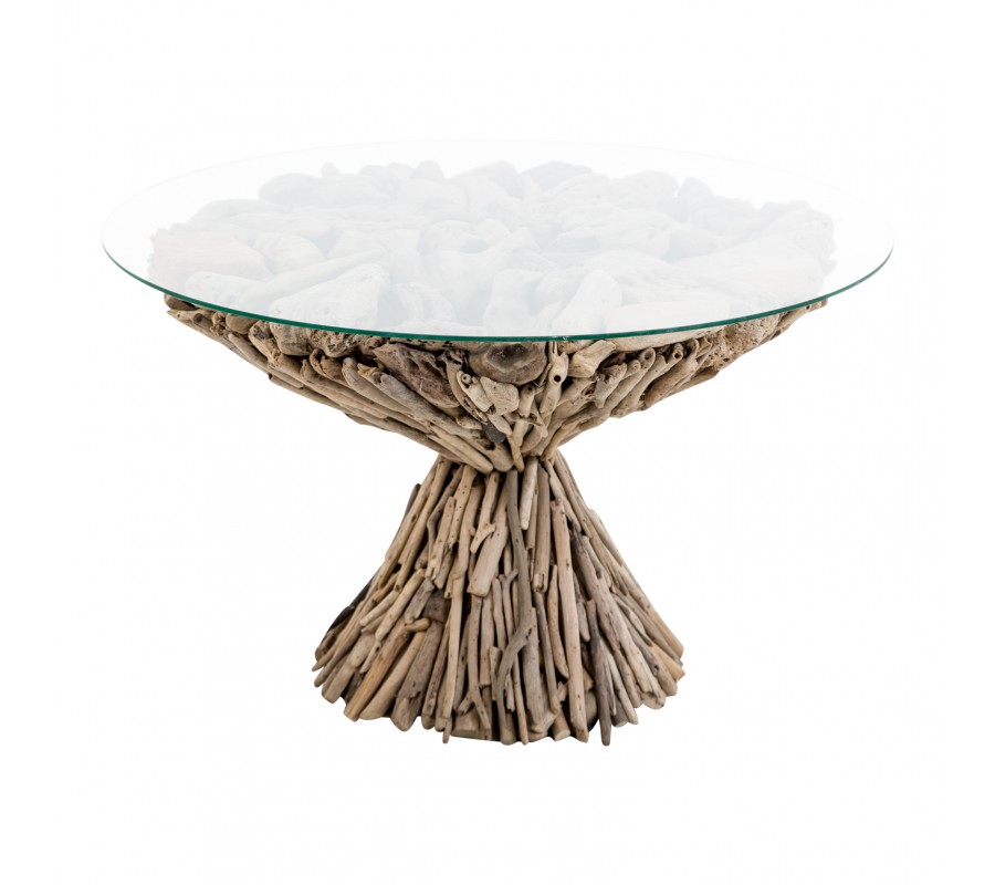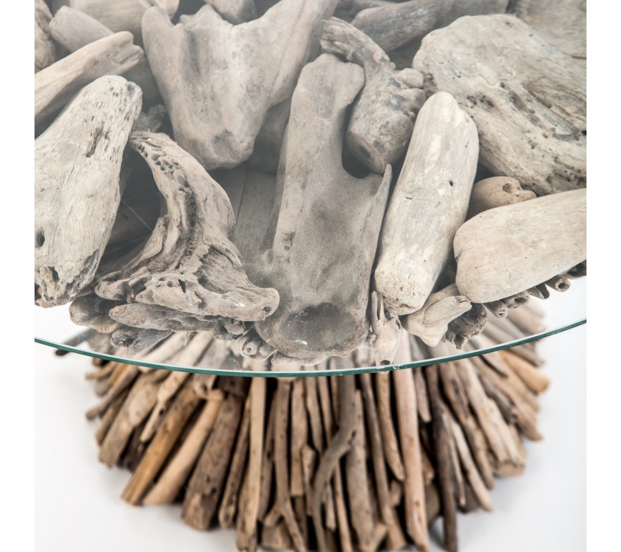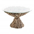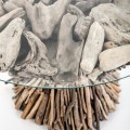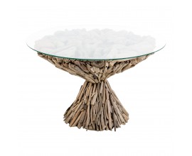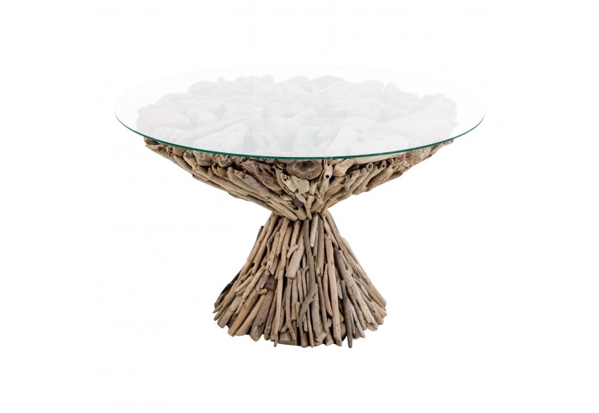 Dizajnový okrúhly konferenčný stolík doslova poskladaný z rôznych nesúrodých kúskov dreva a konárov preklopený sklenenou doskou dodáva interiéru jedinečný dizajn. Vhodný je do prírodne ladených interiérov a veľmi zapadne k sedačke v hnedej farbe a nestratí sa ani v miestnostiach zariadených v etno štýle..