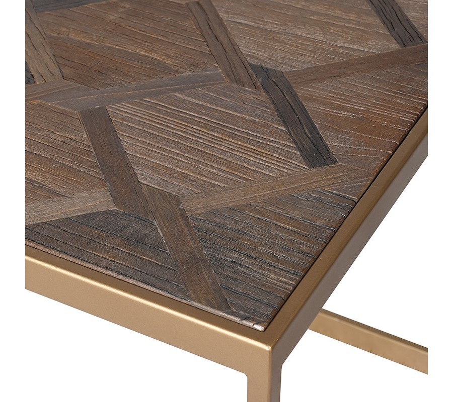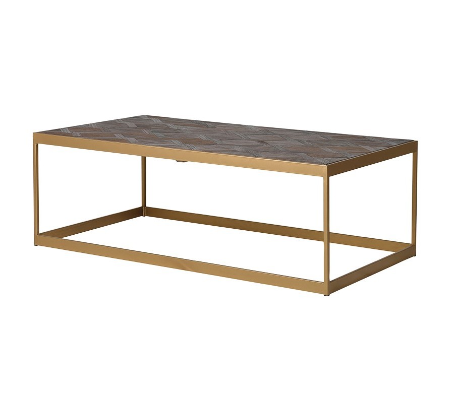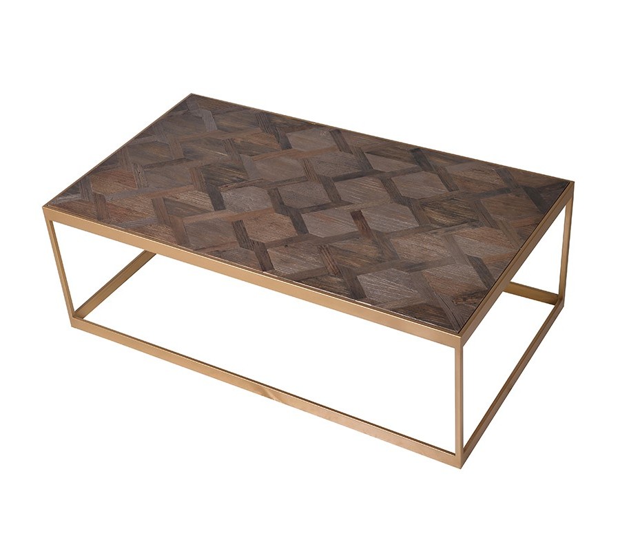 Tento unikátny kúsok z našej štýlovej kolekcie Ramia je skvelým dizajnovým prepojením dreva s kovom, ktorý poteší každého nadšenca štýlu art-deco. Doska konferenčného stolíka pozostáva z brestového dreva, pričom na povrchu je možno vidieť jeho zaujímavú štruktúru a štýlový kosoštvorcový vzor z neho vytvorený. Konštrukcia stola je medená. Farebná kombinácia zlatej s hnedou je skutočne impozantná a celý dizajn dotvára klasický nadčasový obdĺžnikový tvar stola. Pôsobí vzdušne a vaše priestory jednoznačne rozjasní a taktiež im dodá štýlový luxusný nádych. Vynikne najmä v art-deco a moderných interiéroch. Kombinovať sa dá skvelo s naturálnymi farbami a tiež zlatou alebo čiernou.