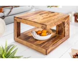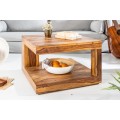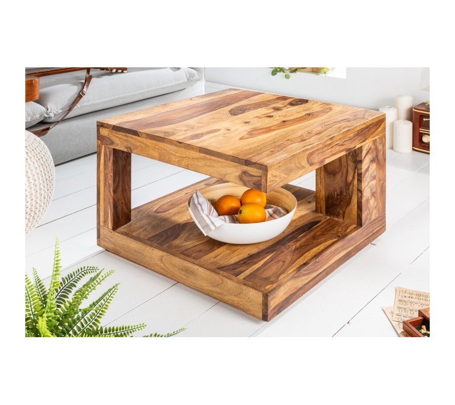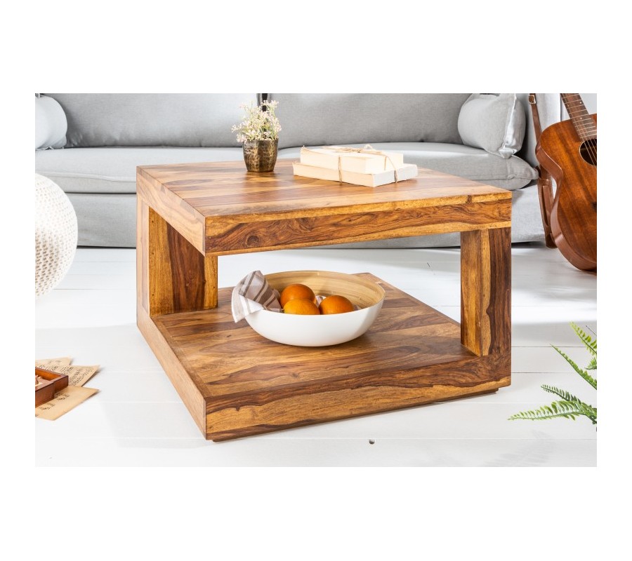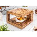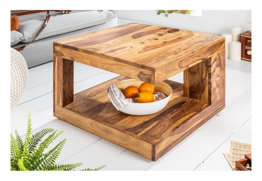 Koloniálny štvorcový konferenčný stolík Giant z lakovaného sheesham dreva s poličkou a asymetrickou konštrukciou 60 cm
