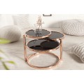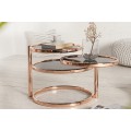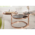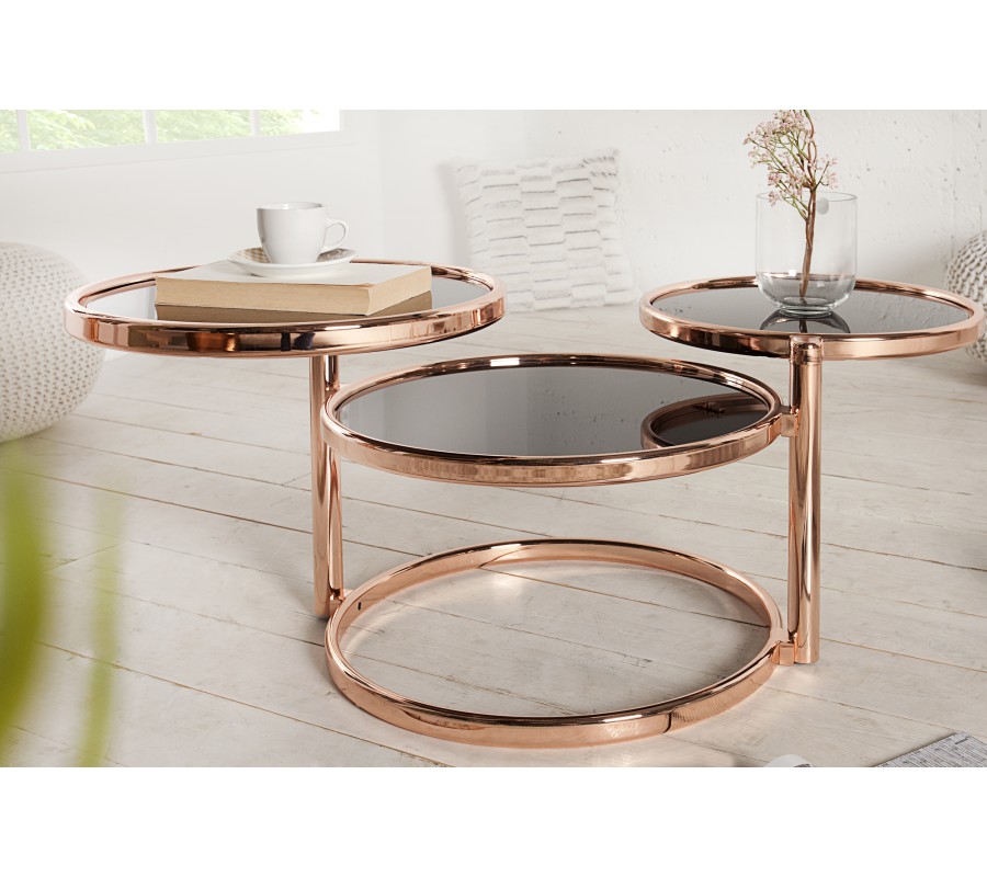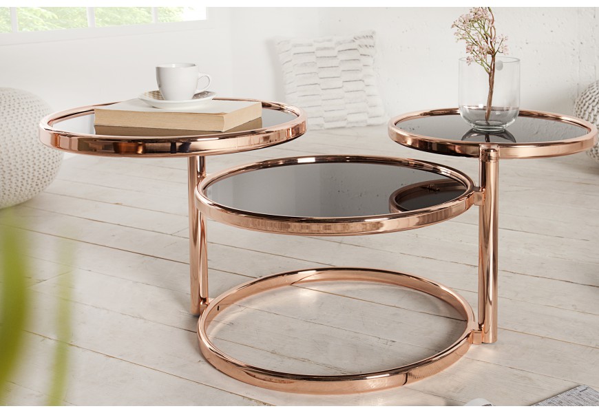 Luxusný štýlový odkladací stolík Art Deco vyjadruje hravé kúzlo. Moderný vzhľad úmyselne porušuje tradičné konvencie a rozdeľuje úložný priestor na 3 časti. Stolíky majú pevnú čiernu sklenenú dosku určenú na odkladanie a rám je vyrobený z medi. Farebná kombinácia zdôrazňuje retro faktor tohto kusu nábytku. Rozmery: Šírka: 55 cm / 155 cm (Min./Max.) Vysoký: 45cm Hĺbka: 50cm.