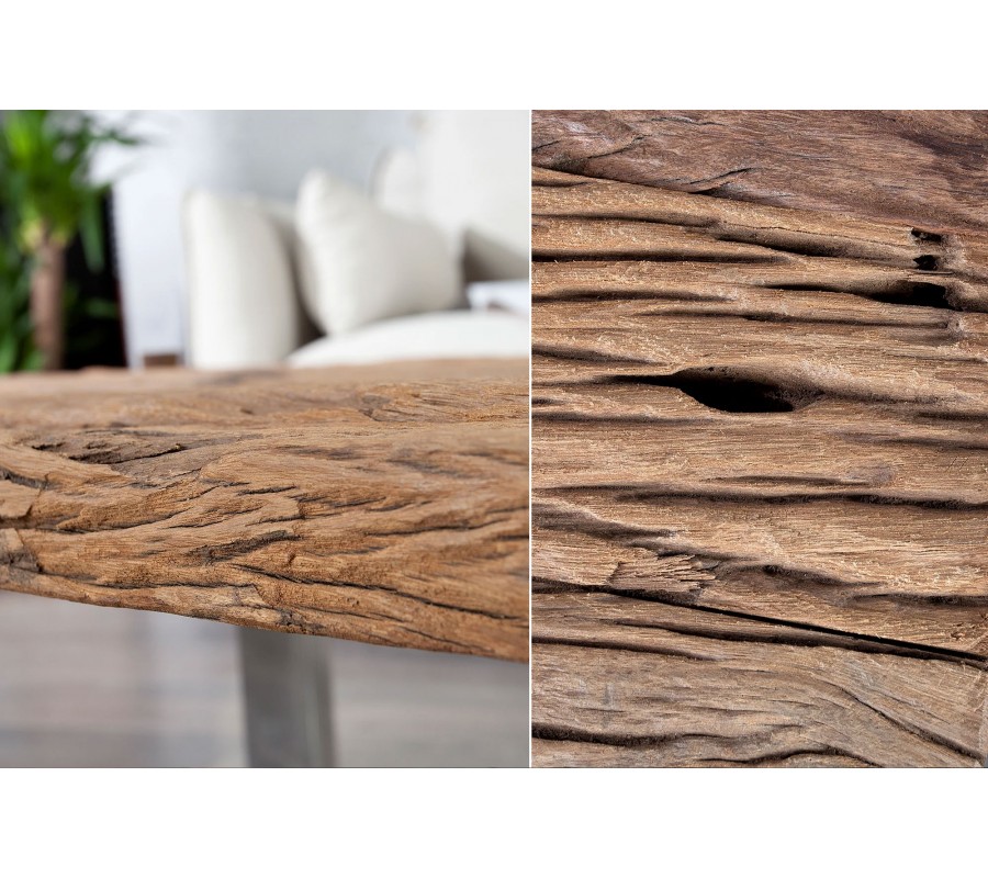 Originálny konferenčný stolík Barracuda II 110cm recyklovaný teak vyznačujúci sa svojím hrubým vzhľadom, radiacej sa do kolekcie nábytku BARRACUDA má tieto vlastnosti - Farba: prírodná, materiál: masívne drevo, recyklované, čiastočne zvetrané Teakové drevo, kovové nohy. Keďže sa jedná o ručnú prácu a prírodný produkt, tak sú možné isté farebné odchýlky alebo hrbole. Úmyselné stopy používania - diery, praskliny a nedokonalosti sú typickými znakmi tejto série. Sklenená doska nie je zahrnutá v cene.
