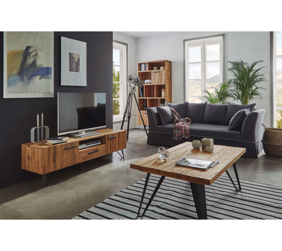 Industriálny konferenčný stolík Anselmo je vyrobený z kvalitného masívneho agátového dreva. Na jeho povrchu možno vidieť zaujímavú kresbu dreva, ktorý robí tento kúsok jedinečným a originálnym. Kombinácia svetlohnedého dreva s čiernymi dizajnovými nožičkami z kovu pôsobí vkusne a moderne. Tento kúsok zaručene vynikne vo vašej industriálne ladene obývačke. Dá sa taktiež jednoducho kombinovať so širokou škálou farieb a doplnkami z dreva či kovu. Odporúčame kombináciu aj s ďalšími kúskami z našej industriálnej luxusnej kolekcie Anselmo.