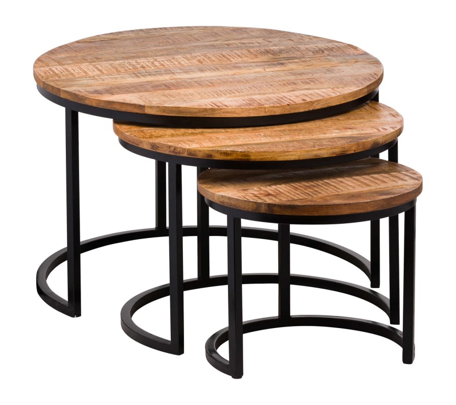Jedinečný set troch okrúhlych konferenčných stolíkov Durano je skvelým kúskom do každého moderného či industriálne ladeného interiéru. Na prvý pohľad zaujme špecifický dizajn stolíka. Drevená doska kruhového tvaru prírodnej hnedej farbe v kombinácii s dizajnovou čiernou konštrukciou z kovu vytvára zaujímavý vzhľad s industriálnym nádychom. Vďaka univerzálnej farebnosti je možné set stolíkov Durano jednoducho kombinovať so širokou farebnou škálou a s doplnkami rôznych materiálov. Vašu modernú obývaciu miestnosť oživí a skvelo v nej vynikne.