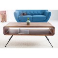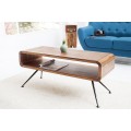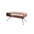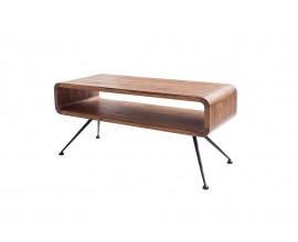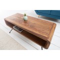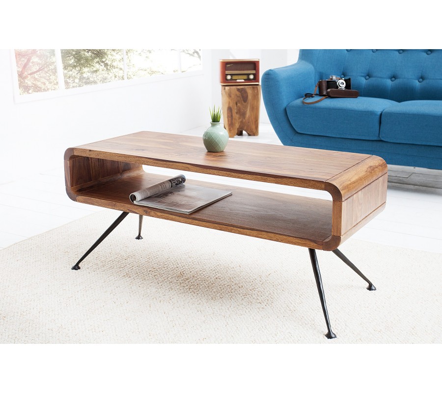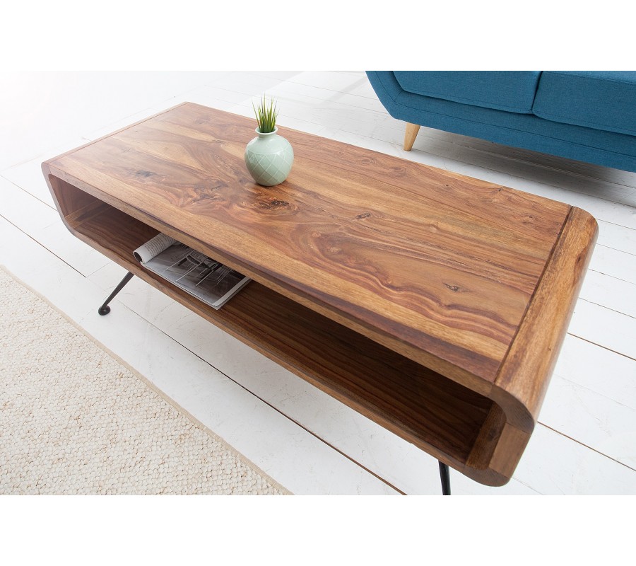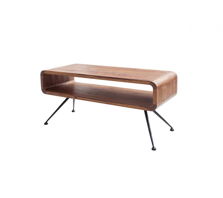 Moderný masívny konferenčný stolík Duvan z hnedého sheeshamového dreva s oblými hranami s poličkou a kovovými nožičkami 100 cm