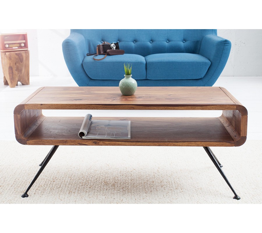 Moderný masívny konferenčný stolík Duvan z hnedého sheeshamového dreva s oblými hranami s poličkou a kovovými nožičkami 100 cm