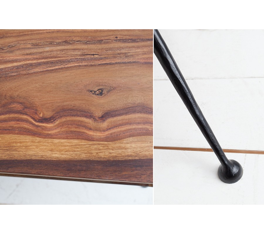 Konferenčný stolík Duvan zaujme na prvý pohľad svojím moderným dizajnom s oblými hranami a originálnou konštrukciou. Je vyrobený z masívneho sheeshamového dreva, ktoré sa vyznačuje výraznou kresbou letokruhov a teplým hnedým odtieňom, dodávajúcim každému kusu nábytku autentický a jedinečný vzhľad.