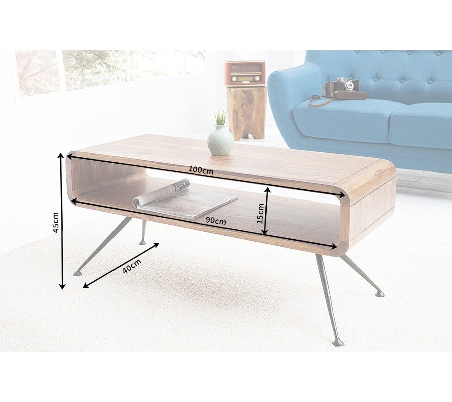 Obdĺžniková doska plynule prechádza do bokov stolíka bez ostrých hrán, čím vytvára jednoliaty oblý rám s integrovanou spodnou poličkou, ideálnou na odkladanie kníh, ovládačov alebo dekorácií. Povrch je hladký a ošetrený lakom, ktorý zvýrazňuje prirodzenú štruktúru dreva.