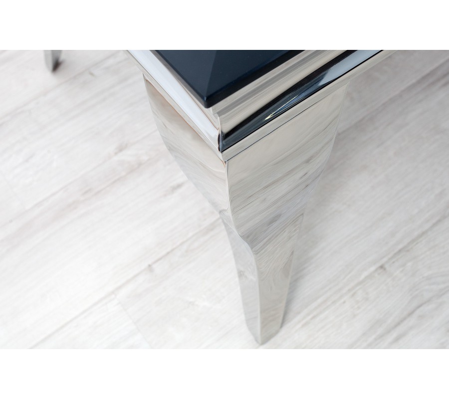 Kovové nožičky v striebornej chrómovej farbe majú lesklý zrkadlový povrch a ich tvar kombinuje klasické barokové zakrivenie v prednej časti s rovnejšími líniami v zadnej časti – vďaka čomu pôsobí stolík ako elegantný prechod medzi minulosťou a súčasnosťou.