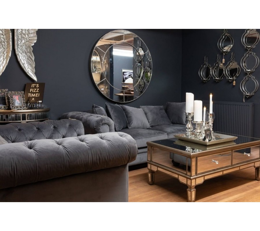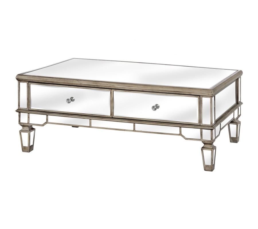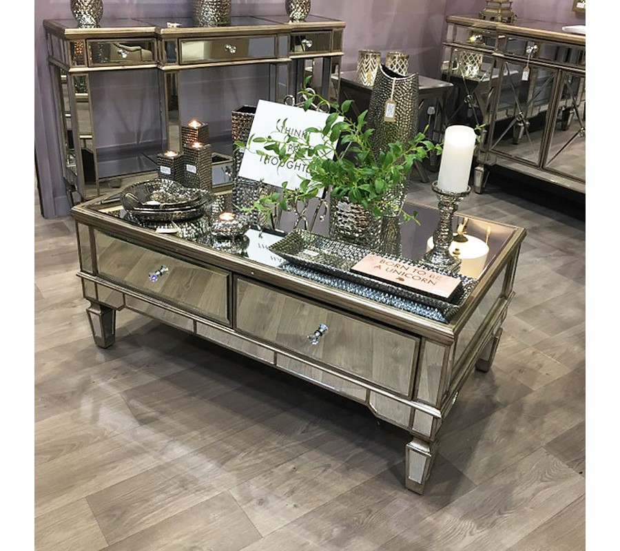 Luxusný konferenčný stolík BELFRY je vo farbe antická zlatá. Na celom jeho povrchu sa nachádzajú zrkadlové sklá, čím je tento stolík výnimočnejší a zaujímavejším ako klasické drevené konferenčné stolíky. Stolík ponúka dve zásuvky na odkladanie predmetov, ktoré sú doplnené o dizajnové kryštálové úchytky.