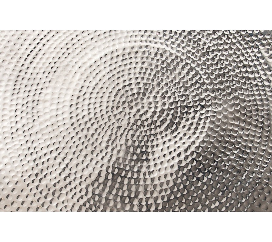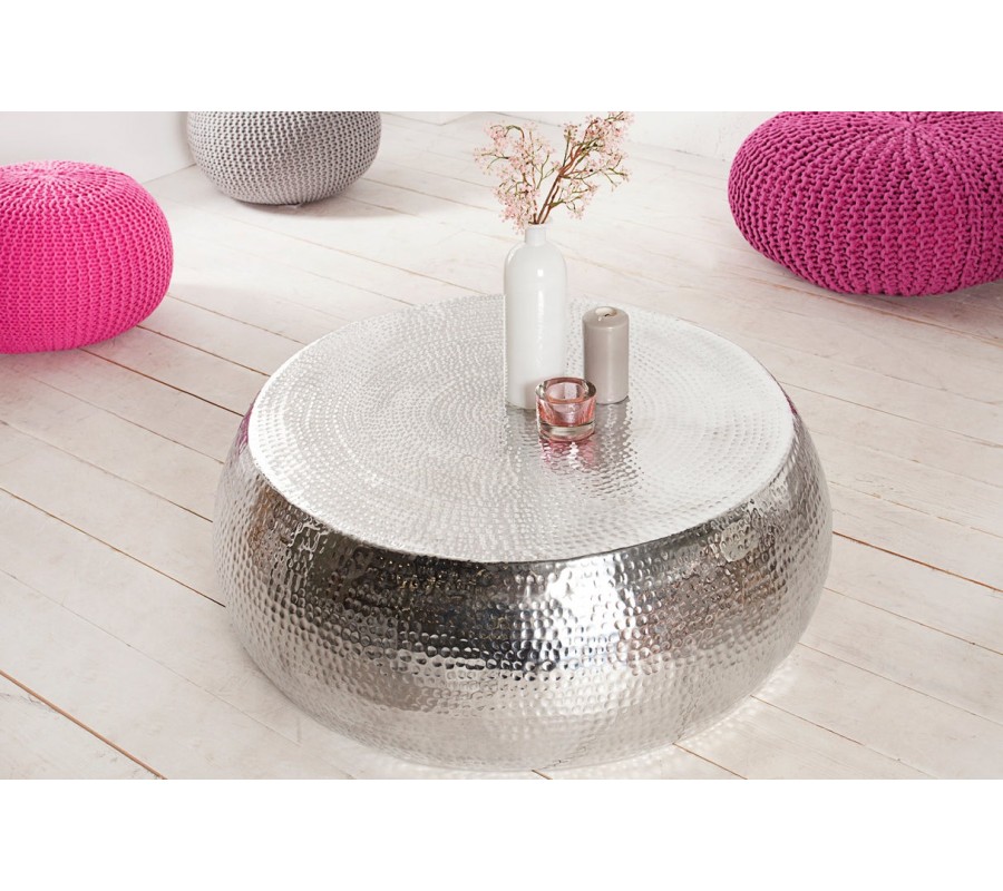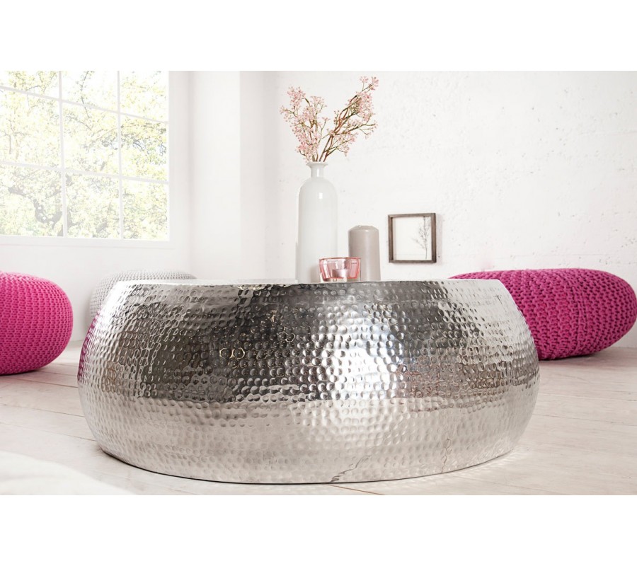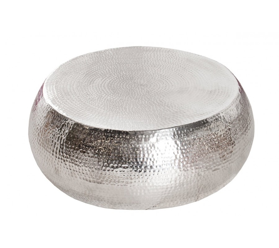 Konferenčný stolík Hammerblow je dizajnový kúsok v štýle glamour, ktorý okamžite upúta svojím strieborným lesklým povrchom a výraznou kladivkovou textúrou. Povrch je zdobený tzv. "hammered" efektom, teda drobnými nepravidelnými jamkami, ktoré vznikajú ručným opracovaním kovu a vytvárajú jemne plastický a zároveň elegantne nedokonalý vzhľad. Vzor je vybíjaný kladivkom s textúrovanou hlavicou.
