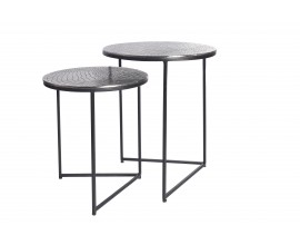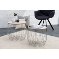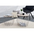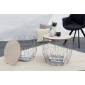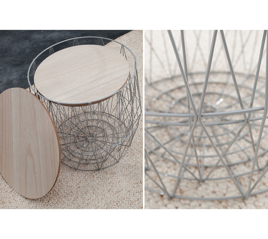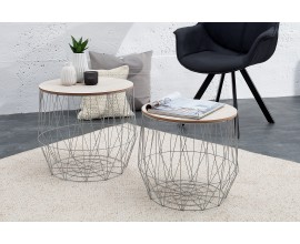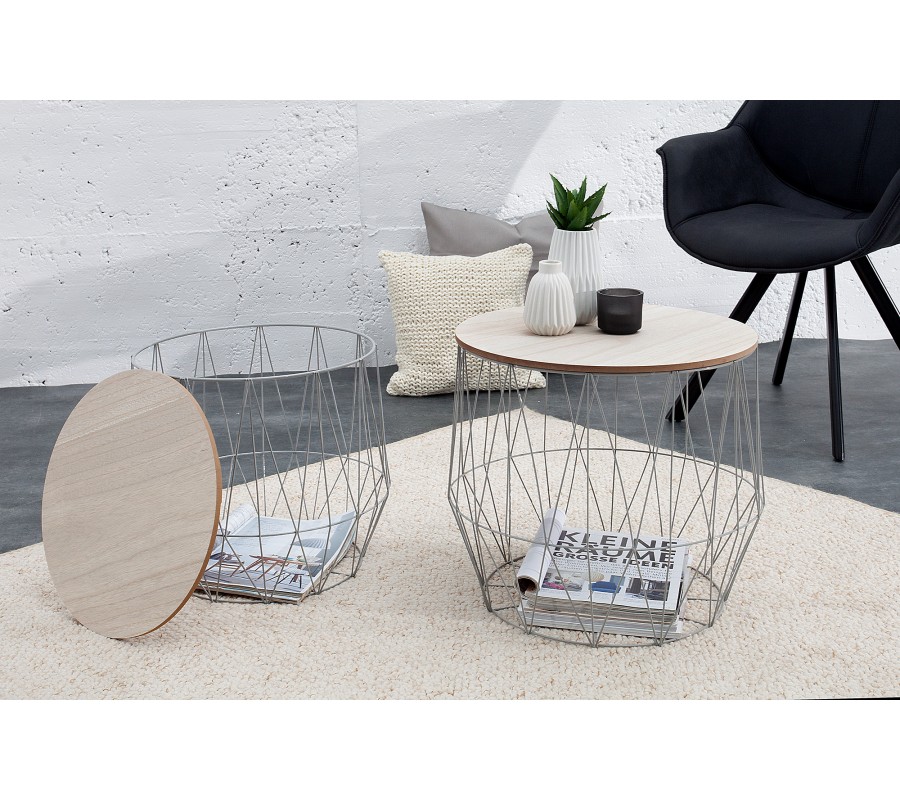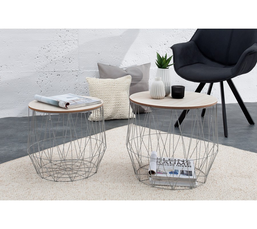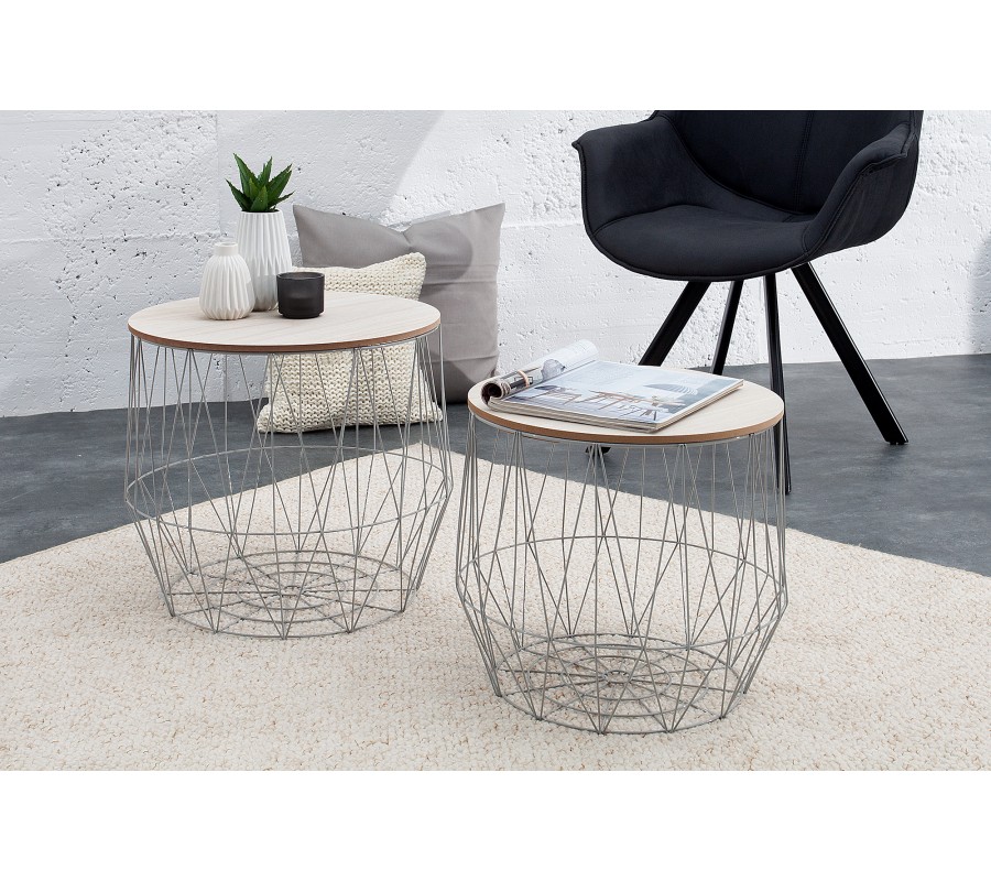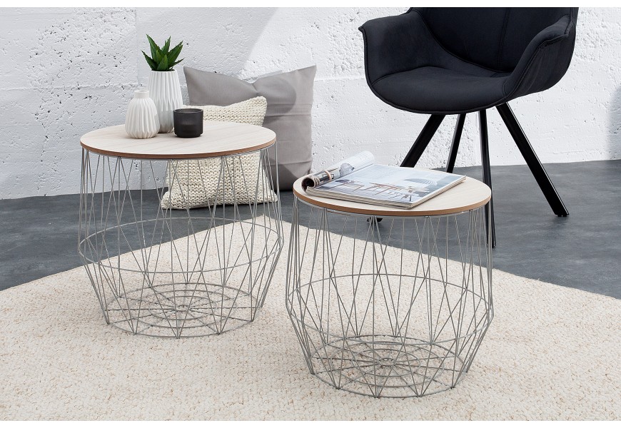 Sada dvoch dizajnových odkladacích stolíkov poteší každého nadšenca obľúbeného, škandinávskeho štýlu. Dominantou stolíkov sú štýlové, kovové podstavce v striebornej farbe. Tie vkusne dopĺňajú jednoduché vrchné dosky v svetlom, prírodnom odtieni, ktoré možno od stolíka oddeliť a využiť tak vnútro podstavcov ako praktický odkladací priestor pre vaše drobnosti. Stolíky vkusne dotvoria vašu obývačku či spálňu a vďaka svojej jemnej farebnosti zapadnú či už do farebne neutrálnych moderných interiérov, ale taktiež aj do miestností s výraznejšími doplnkami a farebnými stenami. Materiál: kov, MDF, dubová dyha. Priemer vrchných dosiek 50 a 40cm.