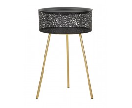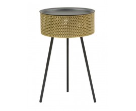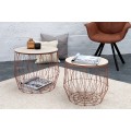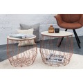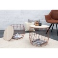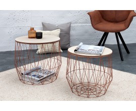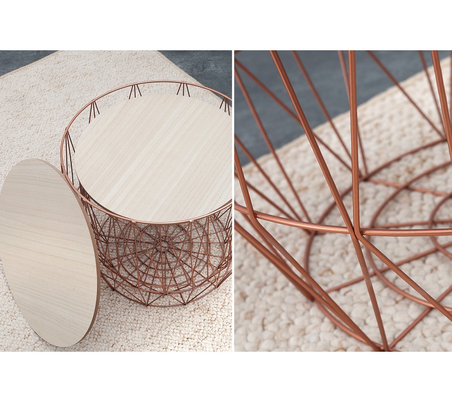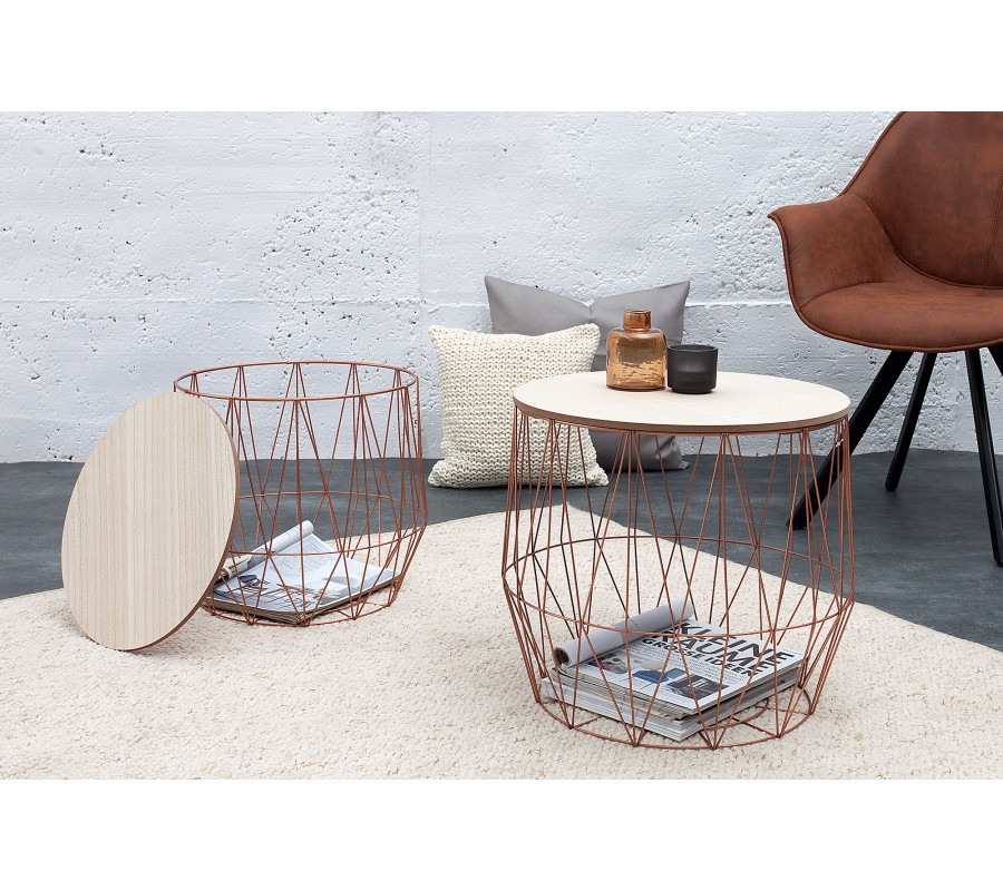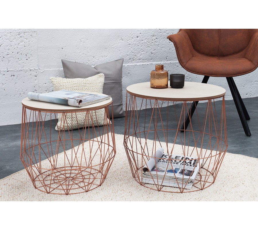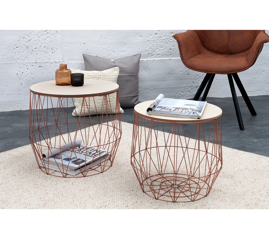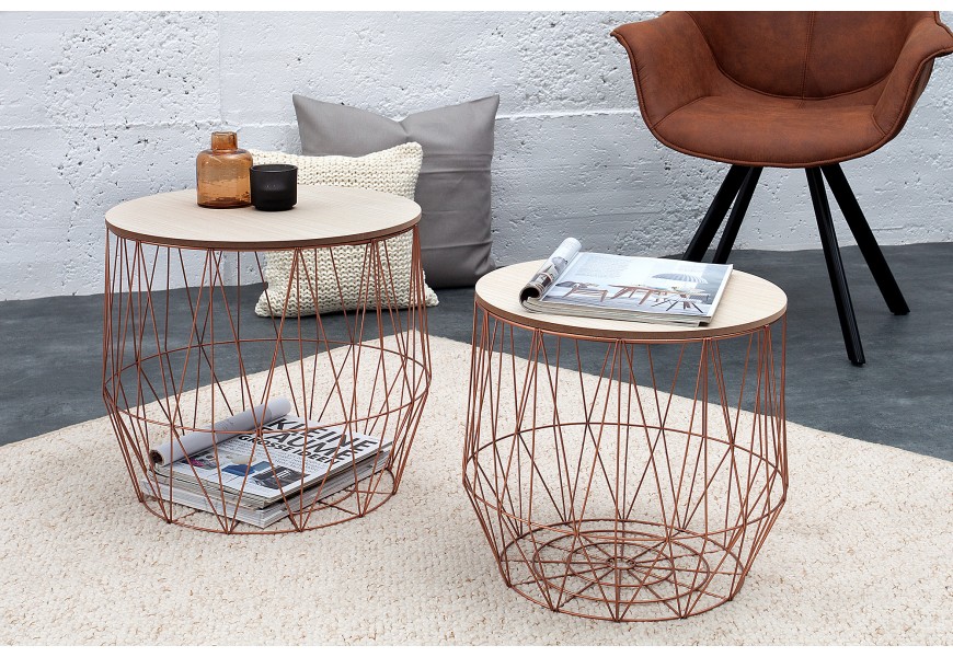 Set štýlových stolíkov s nezvyčajným vzorovaným rámom do akéhokoľvek interiéru. Rám stolíka je vyrobený z kovu v medenej farbe. Vrchná odnímateľná drevená doska je vyrobená z dubovej dyhy a má naturálny vzhľad. Vďaka odnímateľnej doske, je možné uložiť predmety do vnútra stolíka. Stolíky je možné použiť spolu, ale aj oddelene.