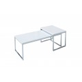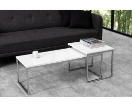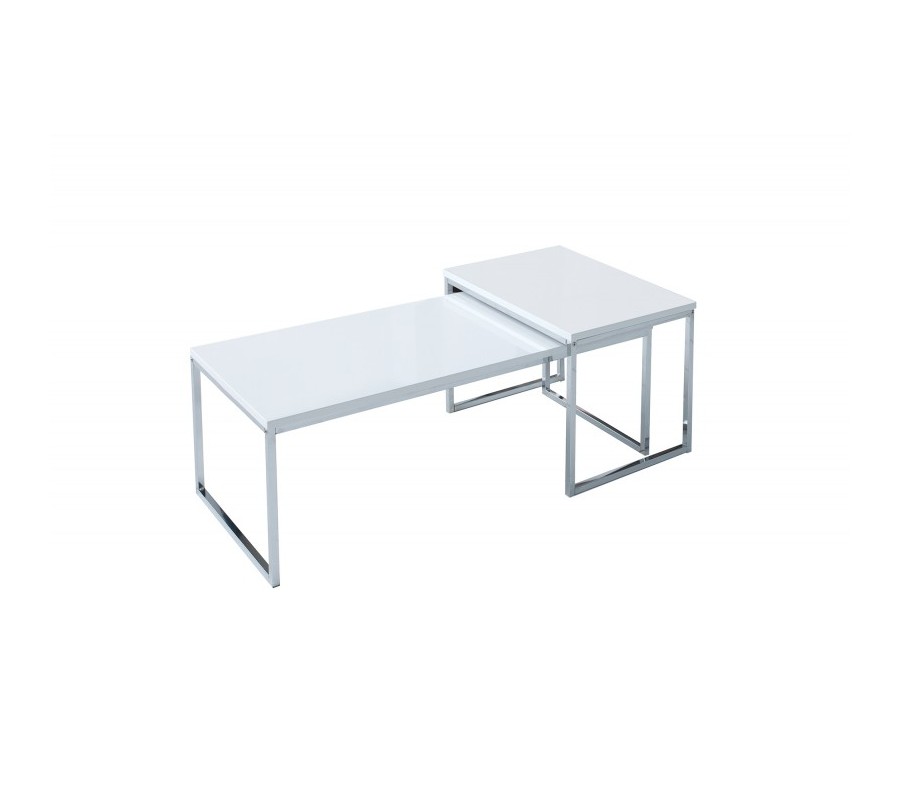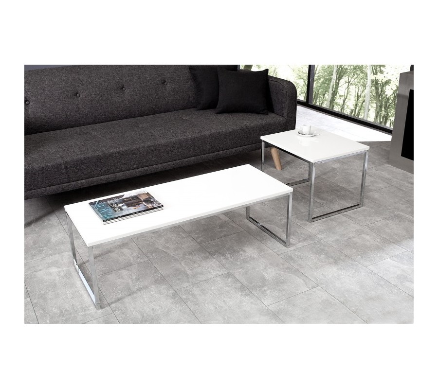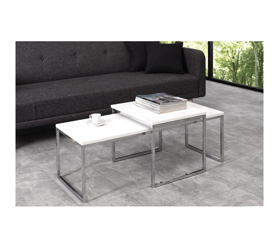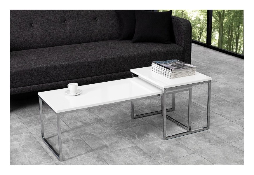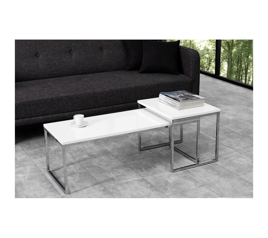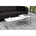 Dizajnový set stolíkov Nobile je svojim prevedením vhodný predovšetkým do moderne zariadených interiérov. Chrómované, kovové nohy sú doplnené vrchnými doskami z lakovaného MDF materiálu v bielej farbe, ktorý ešte viac podčiarkuje ich moderný dizajn. Vďaka zaujímavej forme, ktorá sa skladá z dvoch kusov rozličných rozmerov si viete stolíky "poskladať" presne tak, ako Vám to vyhovuje.