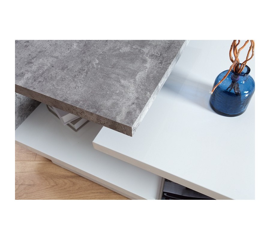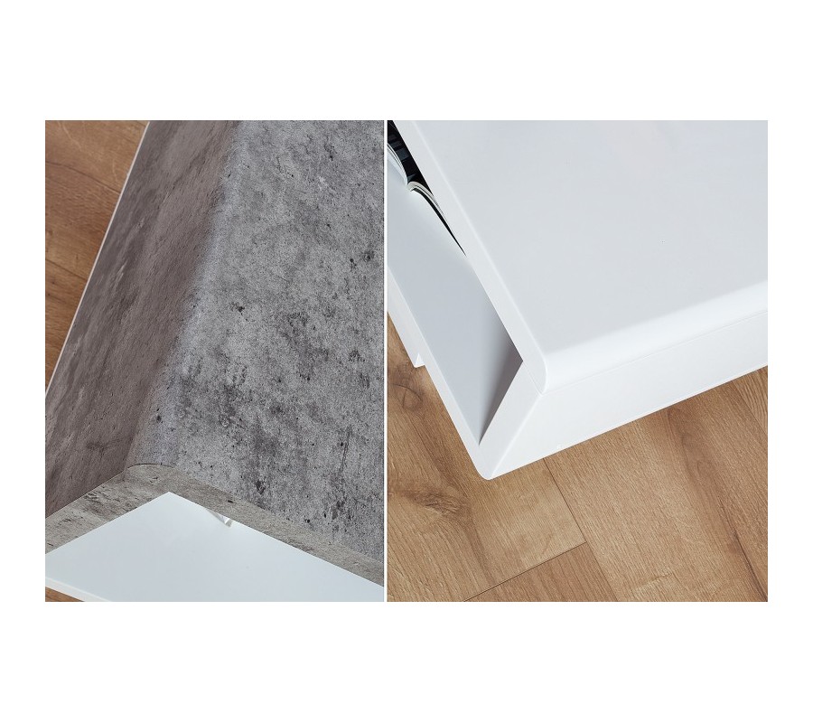Dizajnový konferenčný stolík Concept na prvý pohľad zaujme svojim atypickým, moderným tvarom a tiež kontrastom čistého, lakovaného MDF povrchu s industriálnym vzhľadom surového betónu. Stolík ponúka dostatok praktického, úložného priestoru a svojim prevedením bude ideálnym doplnkom každej modernej a dizajnovej obývačky. Materiál: Lakované MDF, drevo s betónovou povrchovou úpravou