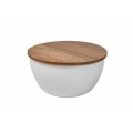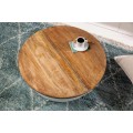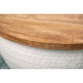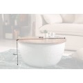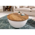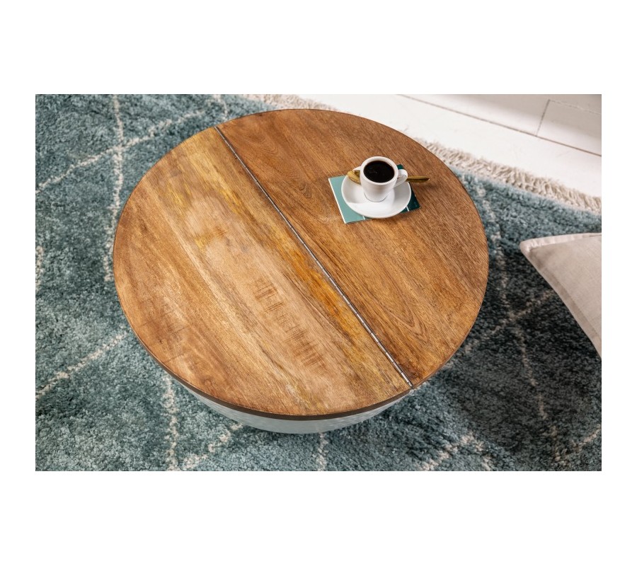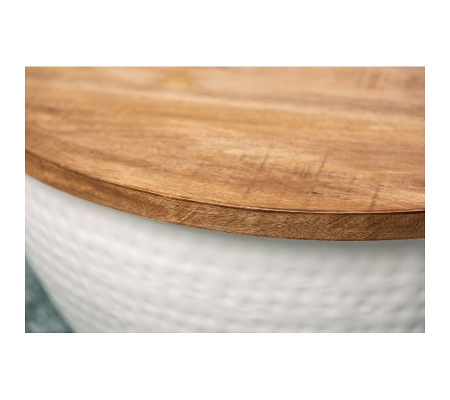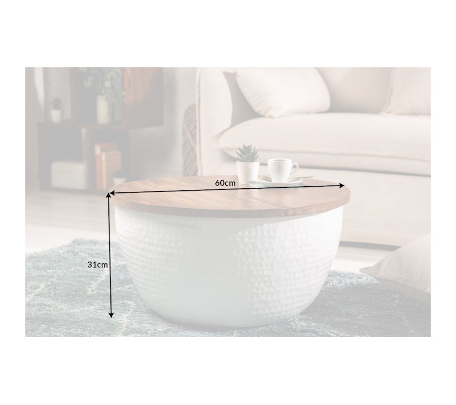 Štýlový konferenčný stolík Sevii vás na prvý pohľad zaujme nevšednou podstavou v tvare zrezanej gule. Podstava je vyrobená z kovu v bielom odtieni s dekoratívnym kladivkovým efektom. Biela kovová časť sa dostáva do harmonického kontrastu s teplým prírodným odtieňom odkladacej dosky stola z kvalitného mangového dreva, ktorá rešpektuje kruhovú geometriu podstavy. Vďaka jednoduchému systému je možné dosku čiastočne otvoriť a do dutého priestoru podstavy odkladať teplé deky či mäkké vankúše, ktoré si počas odpočinku prajete mať vždy poruke. Nadčasové materiály v kombinácii s neutrálnymi farbami a dizajnom vychádzajúcim zo základných geometrických tvarov je tento kúsok veľmi ľahko kombinovateľný a zapadne do rozličných štýlových interiérov. Nenechá sa zahanbiť v spoločnosti dizajnových škandinávskych prvkov ani moderného masívneho či nadčasového kovového zariadenia.