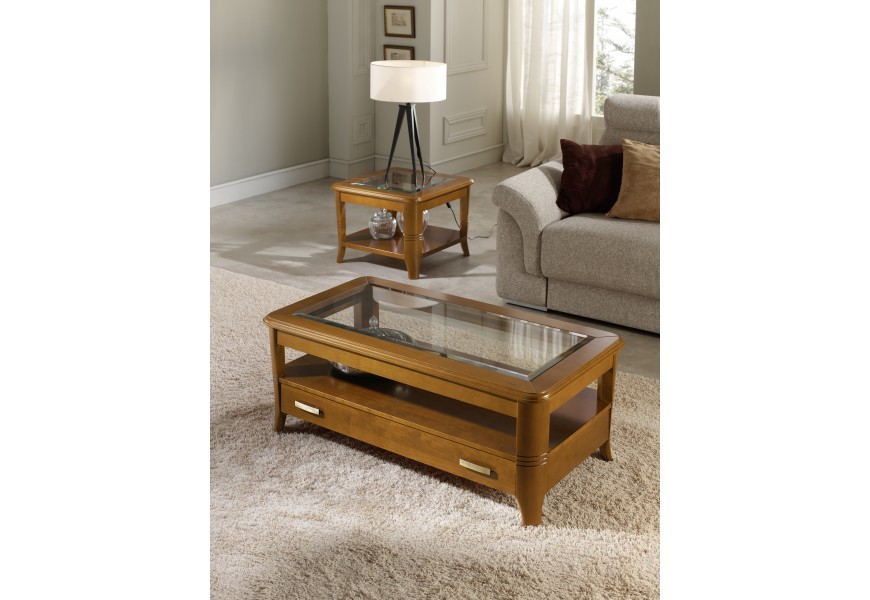 Exkluzívny konferenčný stolík z kolekcie masívneho nábytku Carmen je univerzálnym a nadčasovým kúskom prvotriednej kvality, ktorý si svoje miesto nájde v rôznych interiéroch. Je zhotovená z kvalitného bukového masívu, doplnená o štýlové zlaté úchytky a sklenený povrch. Rustikálny konferenčný stolík Carmen II môžete jednoducho skombinovať s inými kúskami tejto kolekcie. Rovnako ako všetok nábytok kolekcie Carmen, je možné aj tento stolík vyhotoviť v štyroch farebných prevedeniach podľa vzorkovníka. Od konferenčného stolíku Carmen I sa líši v rozmeroch. Produkt na fotografií je vo farebnom prevedení čerešňa.