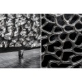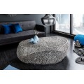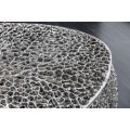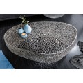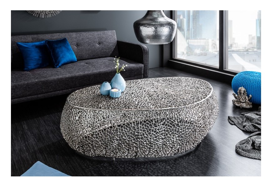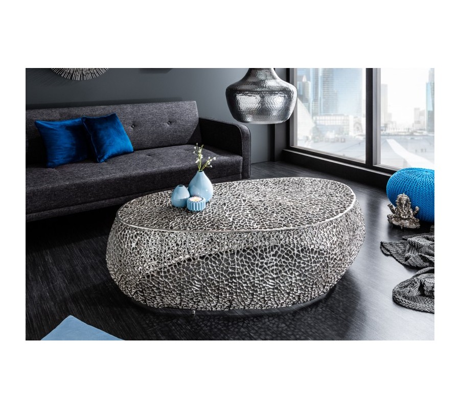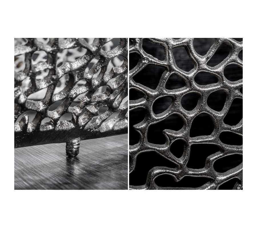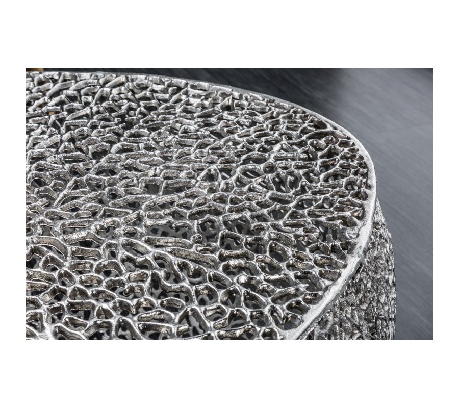 Strieborný stolík zaujme svojim vzhľadom v každej obývačke. Jeho oválny tvar s motívom pripomínajúcim štruktúru listu dáva tomuto jedinečnému stolíku organický vzhľad. Nespočetné a nepravidelné dierky a rôzne výrezy a plôch stolíka dodávajú vášmu interiéru ľahkosť a svetlosť a v neposlednom rade aj extravaganciu, ktorou sa vyznačuje aj art-deco štýl. Každý stolík je vyrobený ručne a preto je unikátnym a vďaka svojmu prevedeniu predstavuje pastvu pre vaše oči. Stolík je vyrobený ručne zo zliatiny hliníka, čo mu dodáva ľahkosť. Vhodný je ku tmavšej sedačke, ktorým sa zvýrazní jeho extravagancia a elegancia.